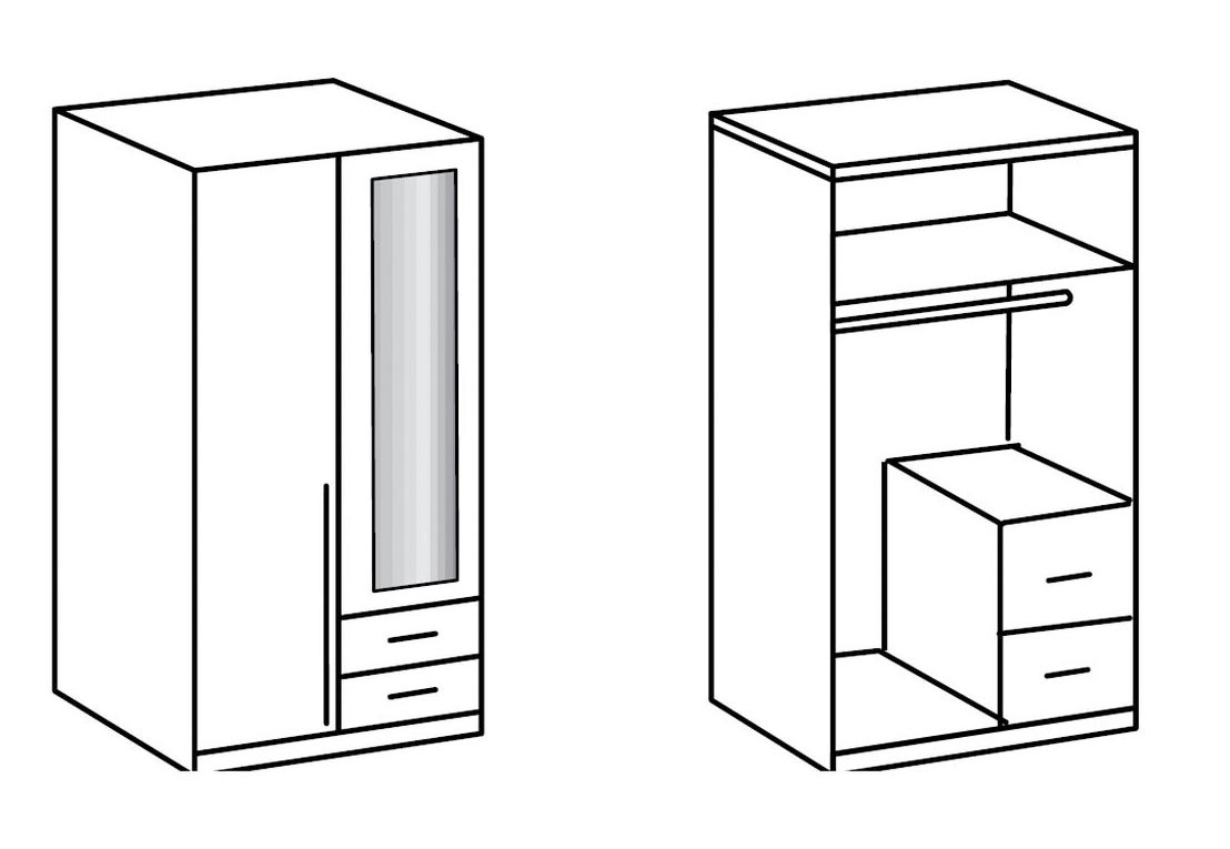 Cette armoire miroir blanche et encadrement gris anthracite pas cher est équipée d'un vestiaire avec tringle de suspension pour les vestes, manteaux, robes longues etc., d'un grand casier de rangement pour les gros volumes et de 2 tiroirs.