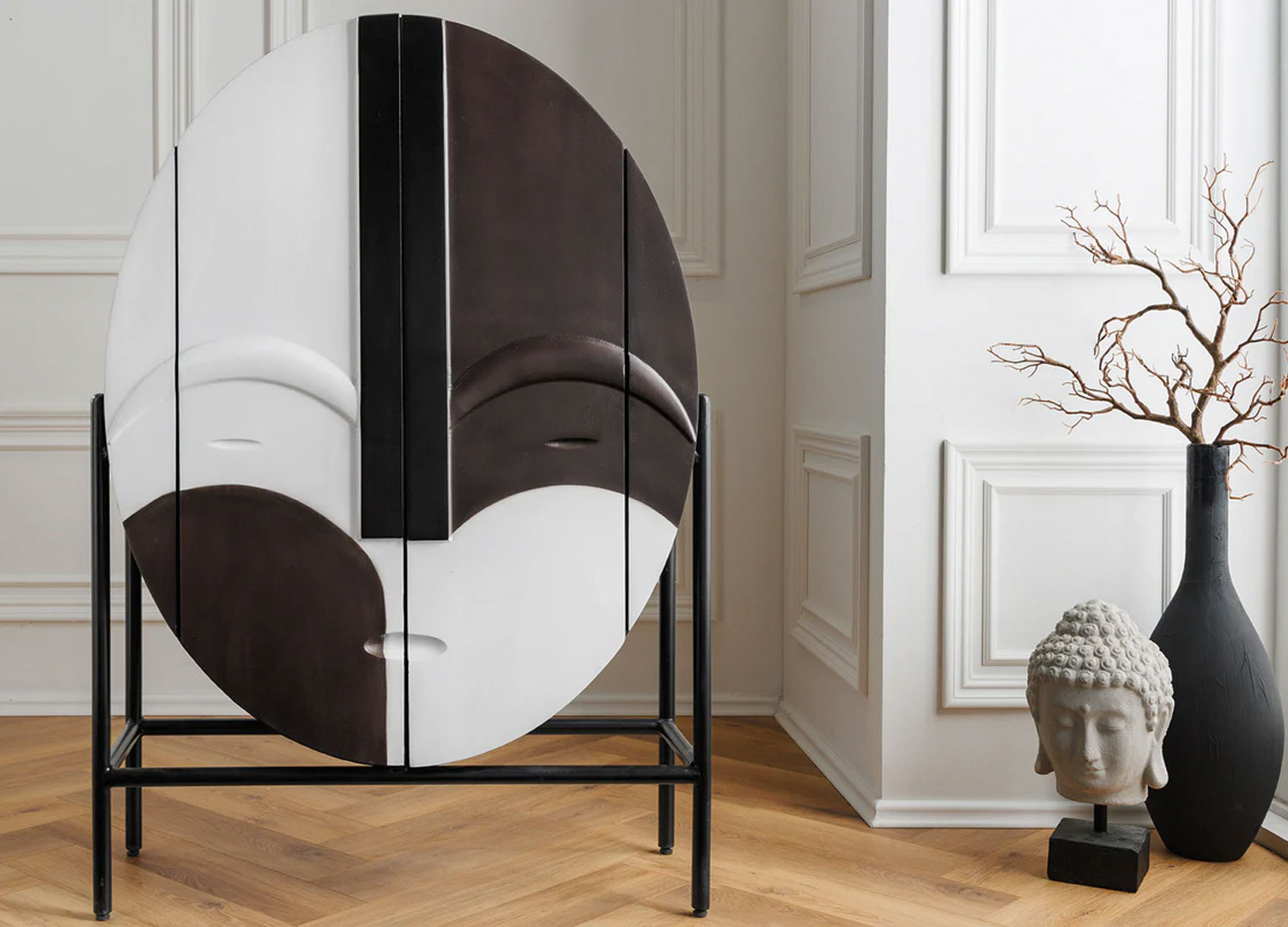 Élégance tribale et mystère ancestral. Ce buffet ovale en manguier massif, aux dimensions généreuses de 120 cm, vous transporte au cœur des rites ancestraux. Ses façades, ornées d'un visage tribal aux teintes profondes de blanc, de marron et de noir, semble murmurer des secrets millénaires. Une pièce unique qui donnera à votre intérieur une atmosphère envoûtante et unique.