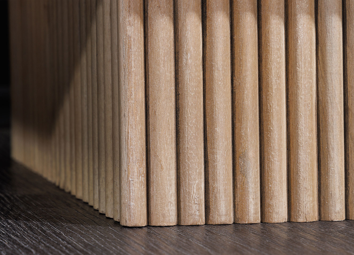 Caractérisé par une coloration blanche des pores, le bois chaulé se démarque particulièrement par sa surface brossée puis blanchie à la chaux. La couleur s’installe alors dans les rainures et souligne le grain du bois. Le veinage du bois devient plus important en fonction de la couleur du meuble à l’origine, qu’il soit foncé ou plus clair.