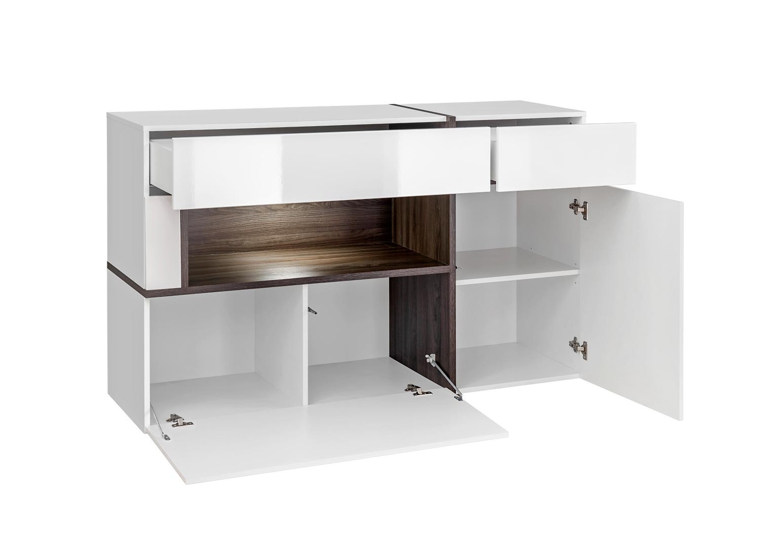 Ce buffet de la collection CROSS dispose de 2 portes, 2 tiroirs et de 1 niche ouverte avec éclairage led blanc. Ce buffet blanc et bois vous apportera les espaces de rangement nécessaires pour la vaisselle ou les accessoires de maison. Ce meuble buffet de 150 cm apportera un look moderne dans votre intérieur. Vous pouvez l'associer aux autres meubles de la même collection pour un ensemble harmonieux.