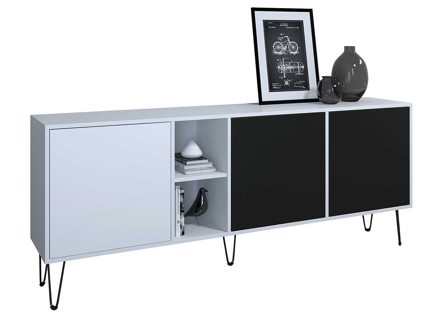 Buffet bas design blanc avec rangements et niches ouvertes