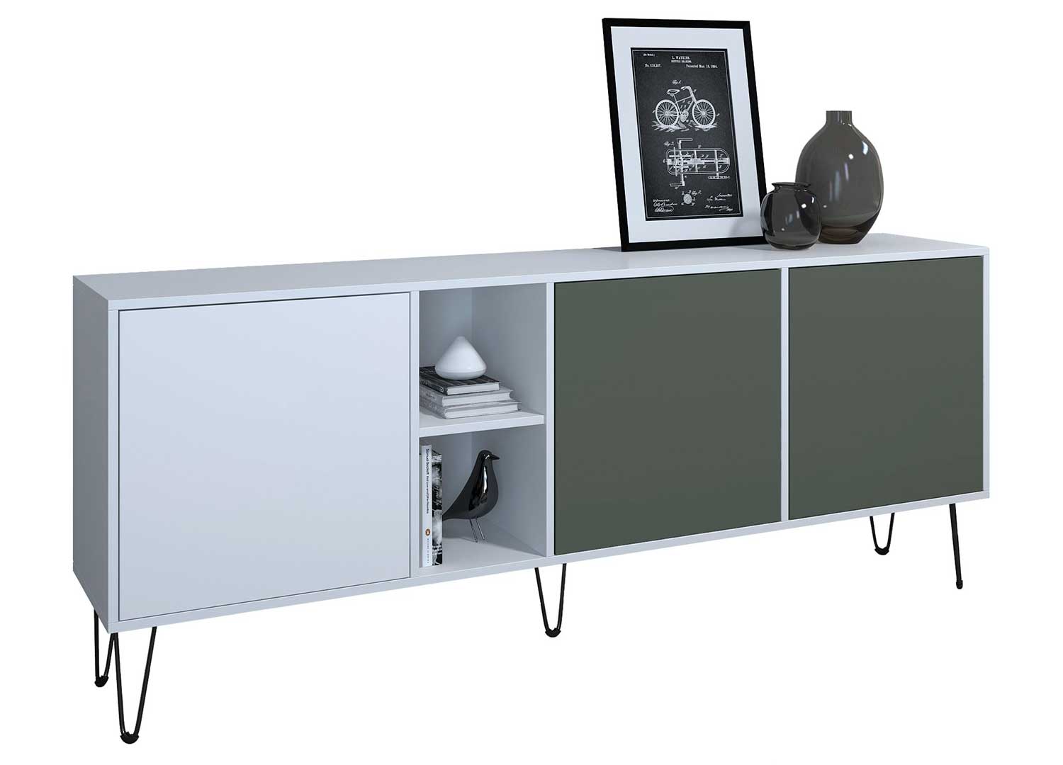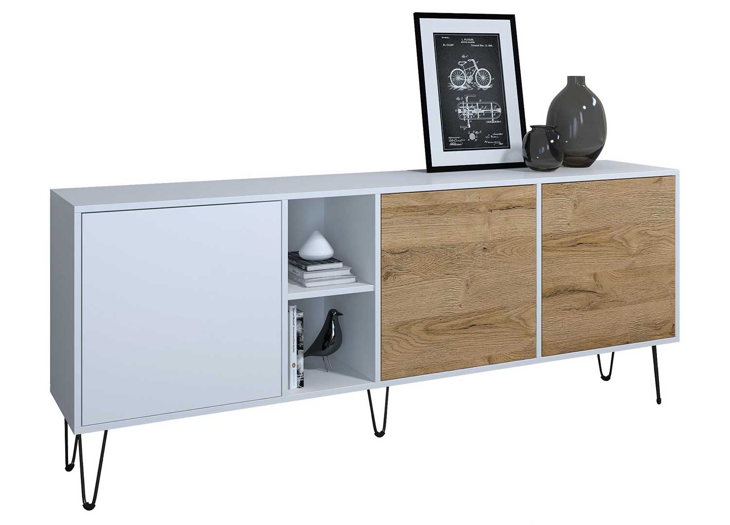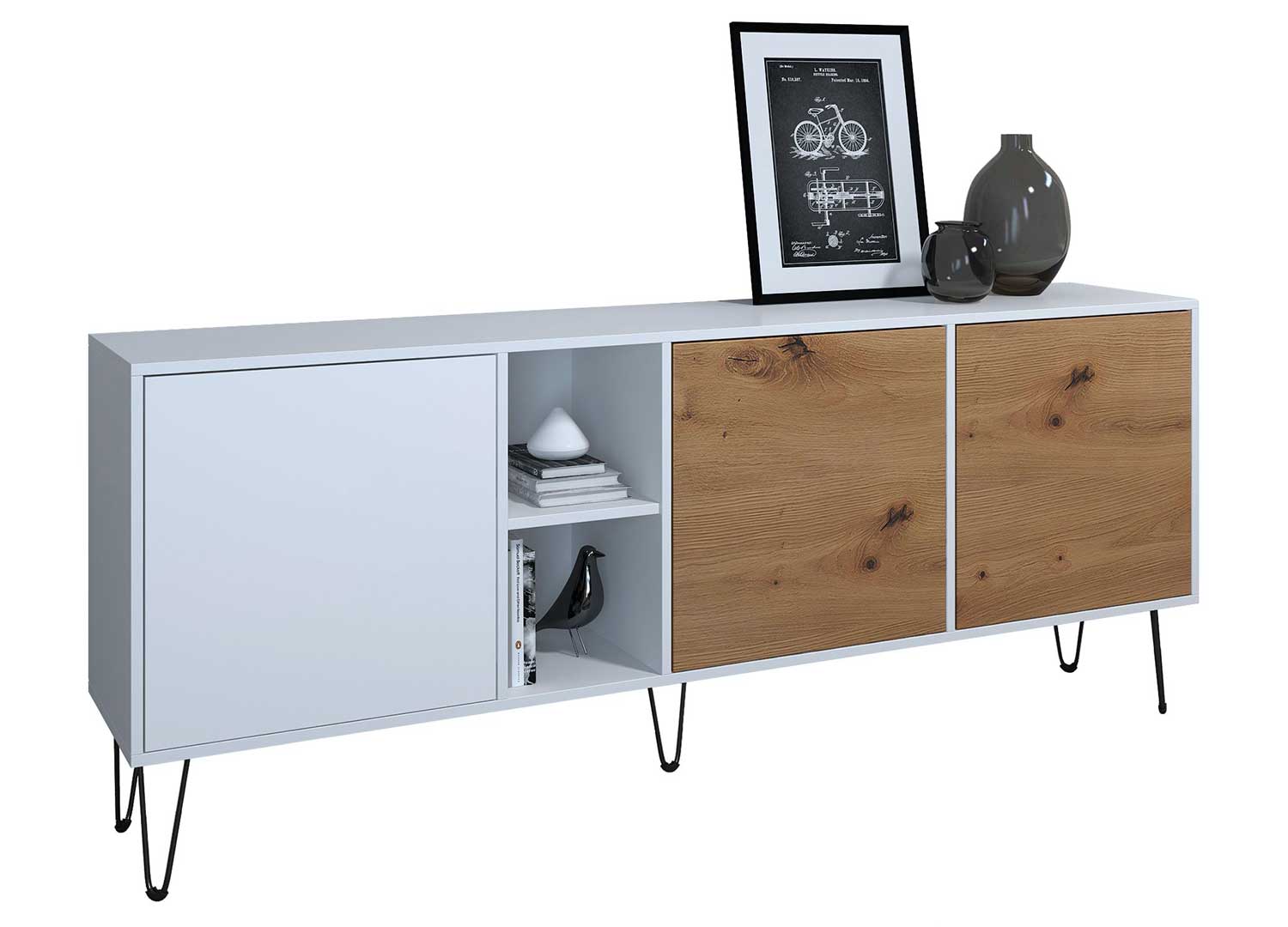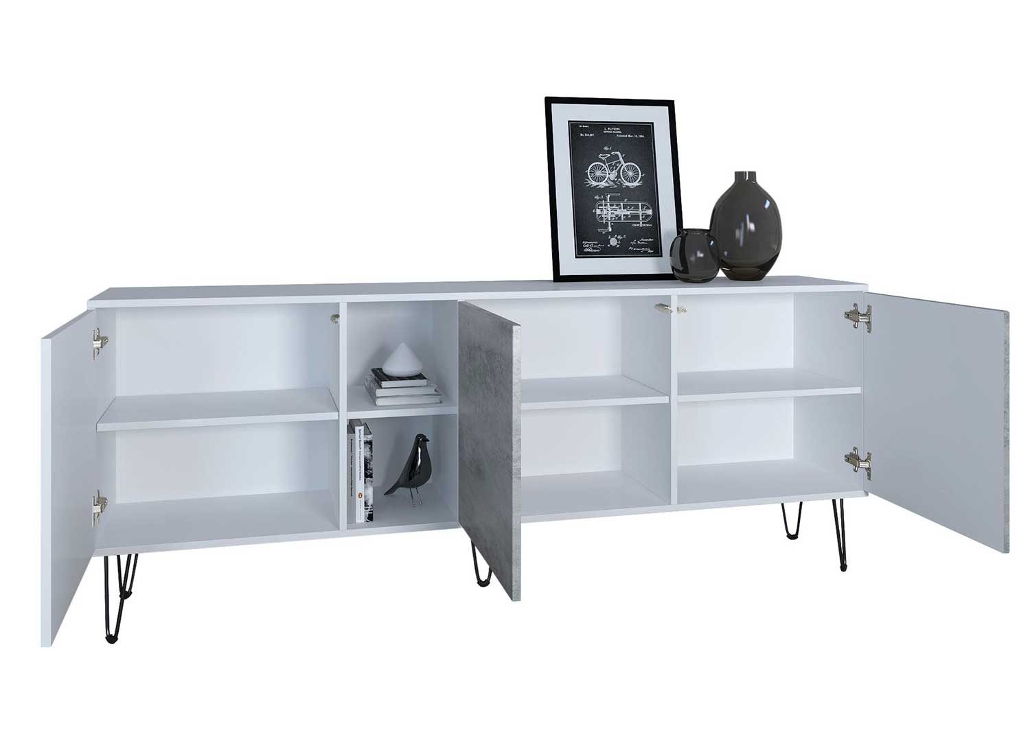 Ce buffet dispose de portes à ouverture par simple pression, pour une façade sans poignée au rendu particulièrement épuré. Derrière les portes, les grands compartiments intérieurs permettent de ranger vaisselle, livres, linge de maison ou objets du quotidien en toute discrétion. Les compartiments ouverts ajoutent un espace de présentation pratique pour quelques éléments décoratifs.