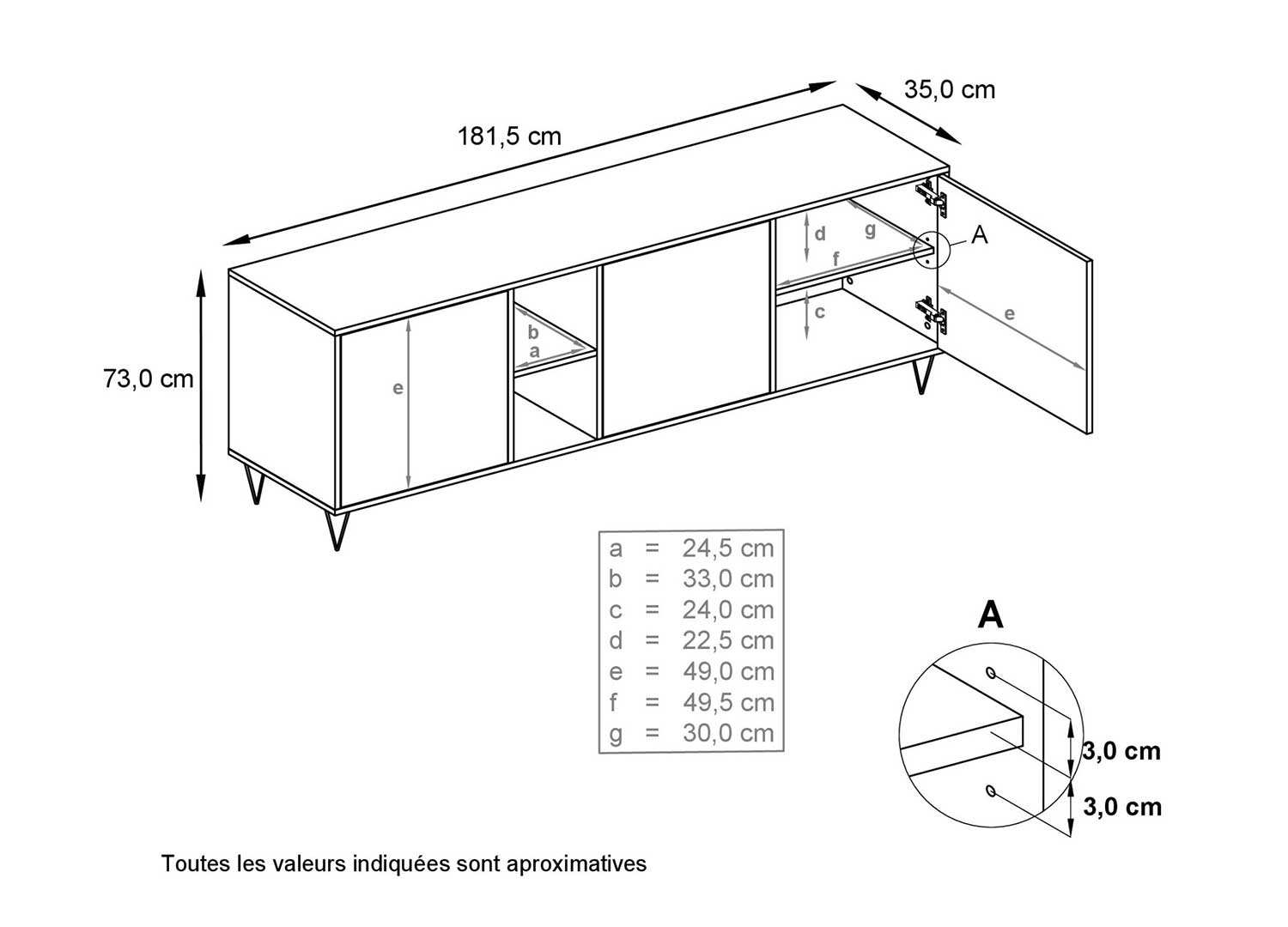 Le buffet Garance séduit aussi par sa stabilité, sa facilité d’entretien et sa fabrication 100 % allemande. Avec ses dimensions de 181,5 x 73 x 35 cm, il offre un format généreux sans alourdir la pièce, ce qui en fait un meuble de rangement aussi fonctionnel qu’actuel. Pour compléter cet aménagement dans le même esprit, découvrez aussi notre commode design aux façades personnalisables, parfaite pour créer une continuité harmonieuse dans votre intérieur.