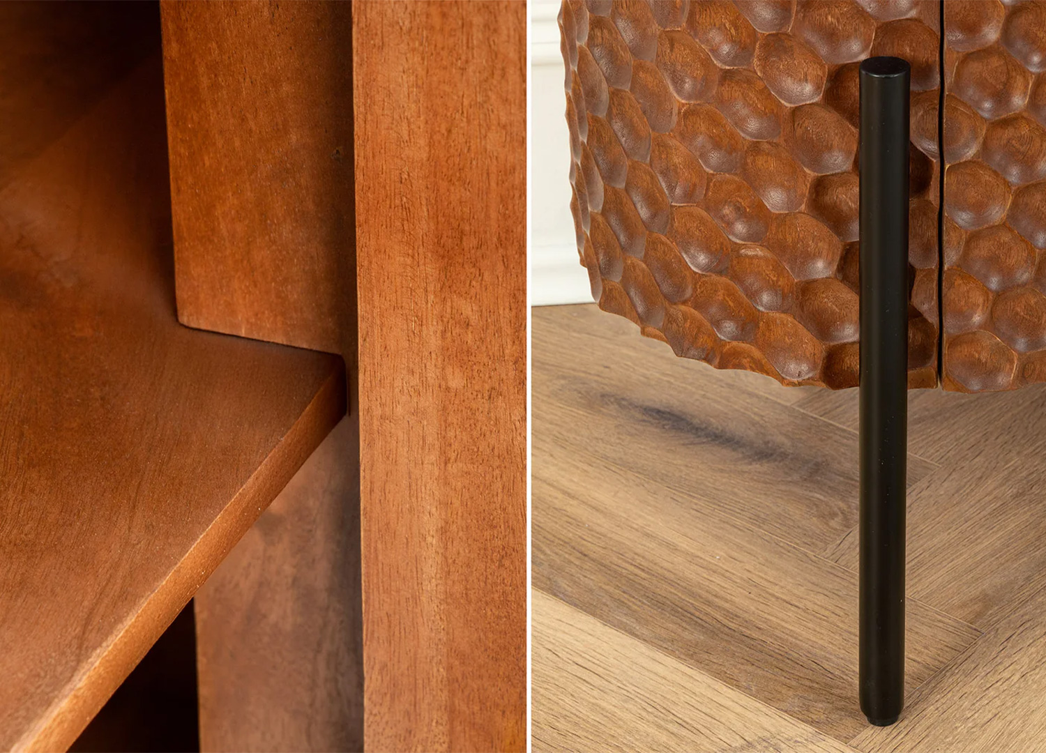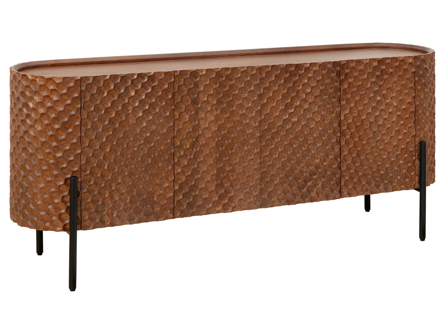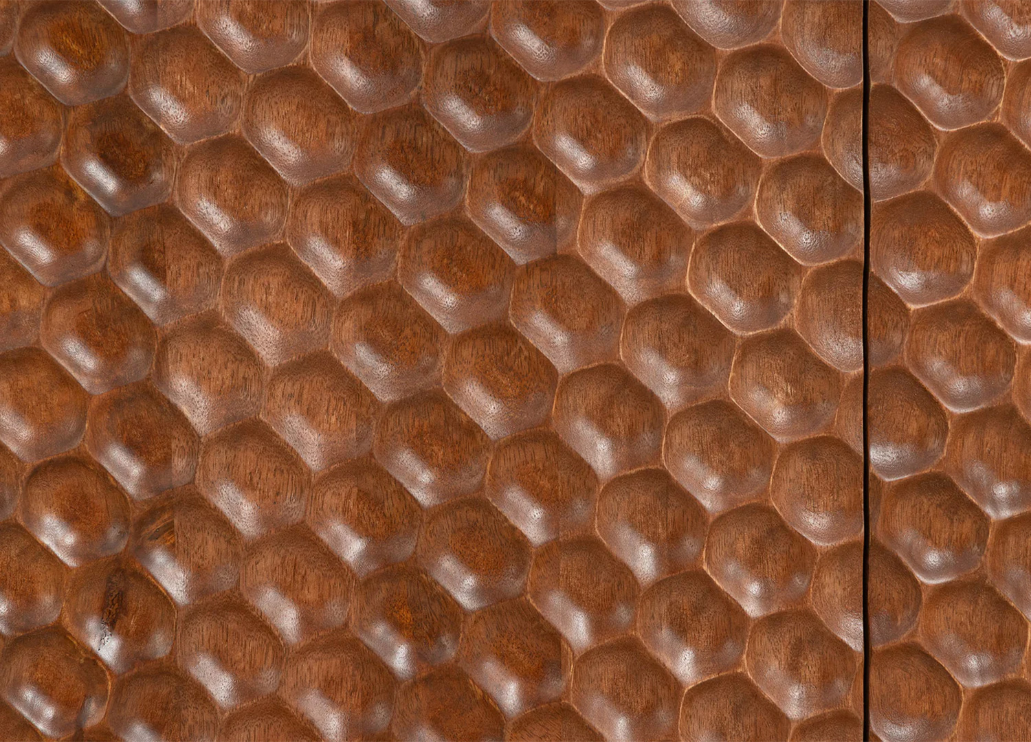 Le buffet MADERA affirme d’emblée une présence décorative rare. Réalisé en manguier massif, il déploie une teinte brune profonde, animée par les nuances naturelles du bois, tandis que sa façade 3D en structure alvéolée donne à l’ensemble un relief presque sculpté. Le motif se prolonge sur les côtés pour composer une ligne continue, enveloppante, au caractère résolument signature.