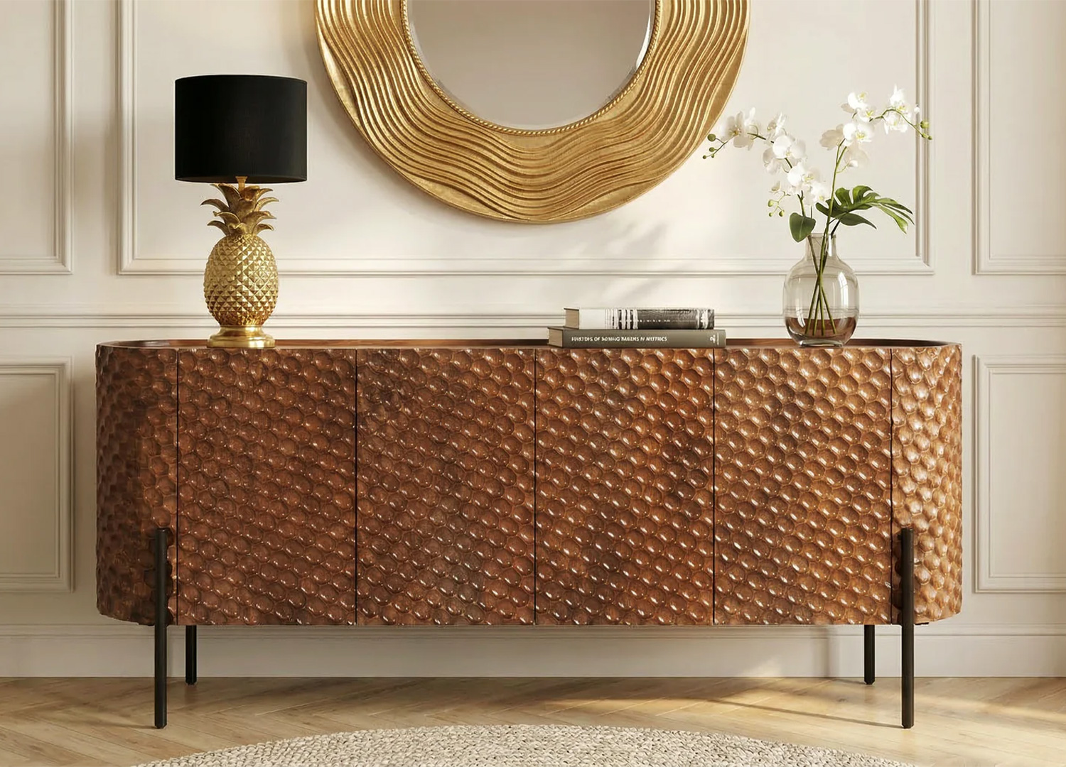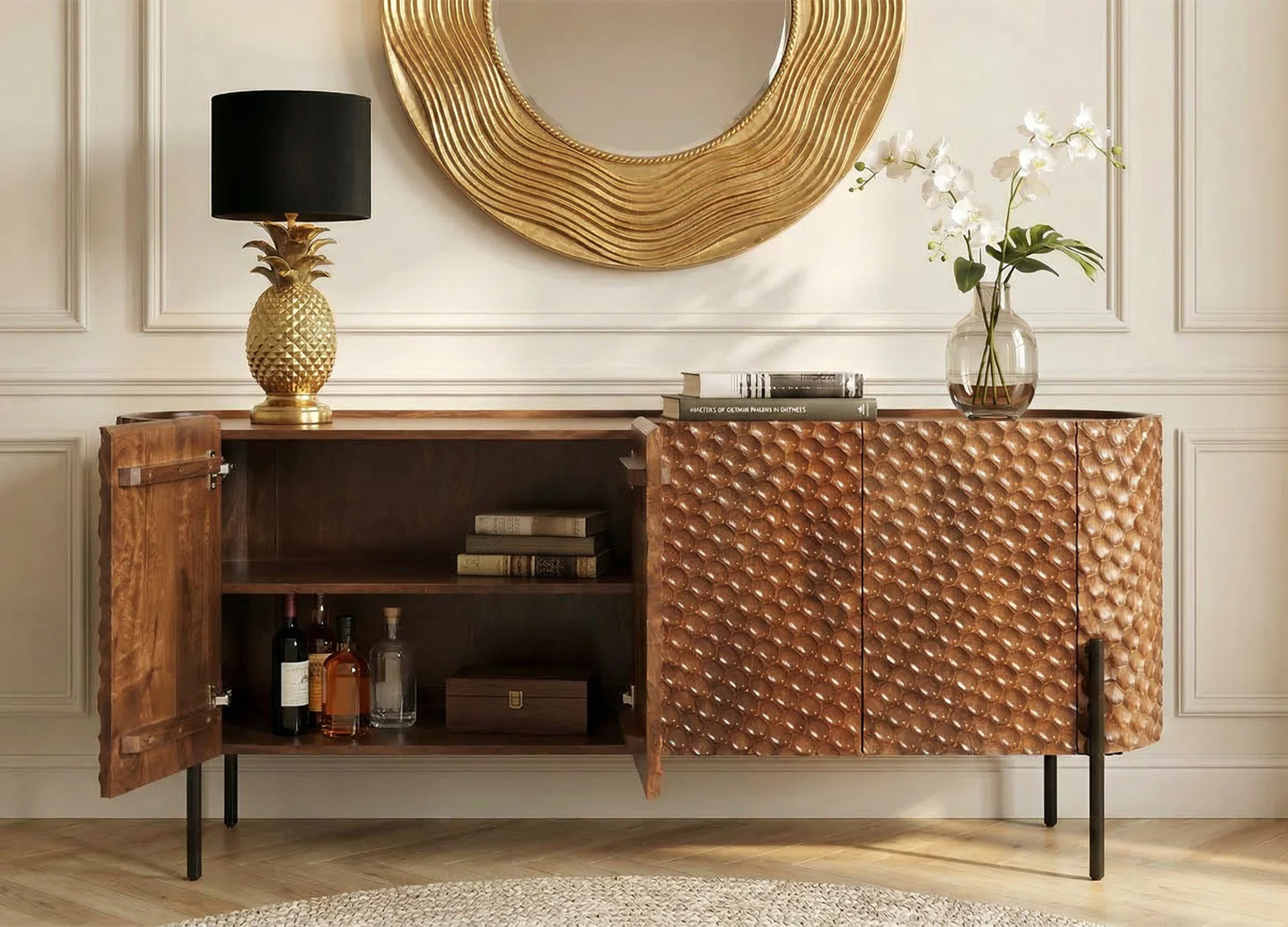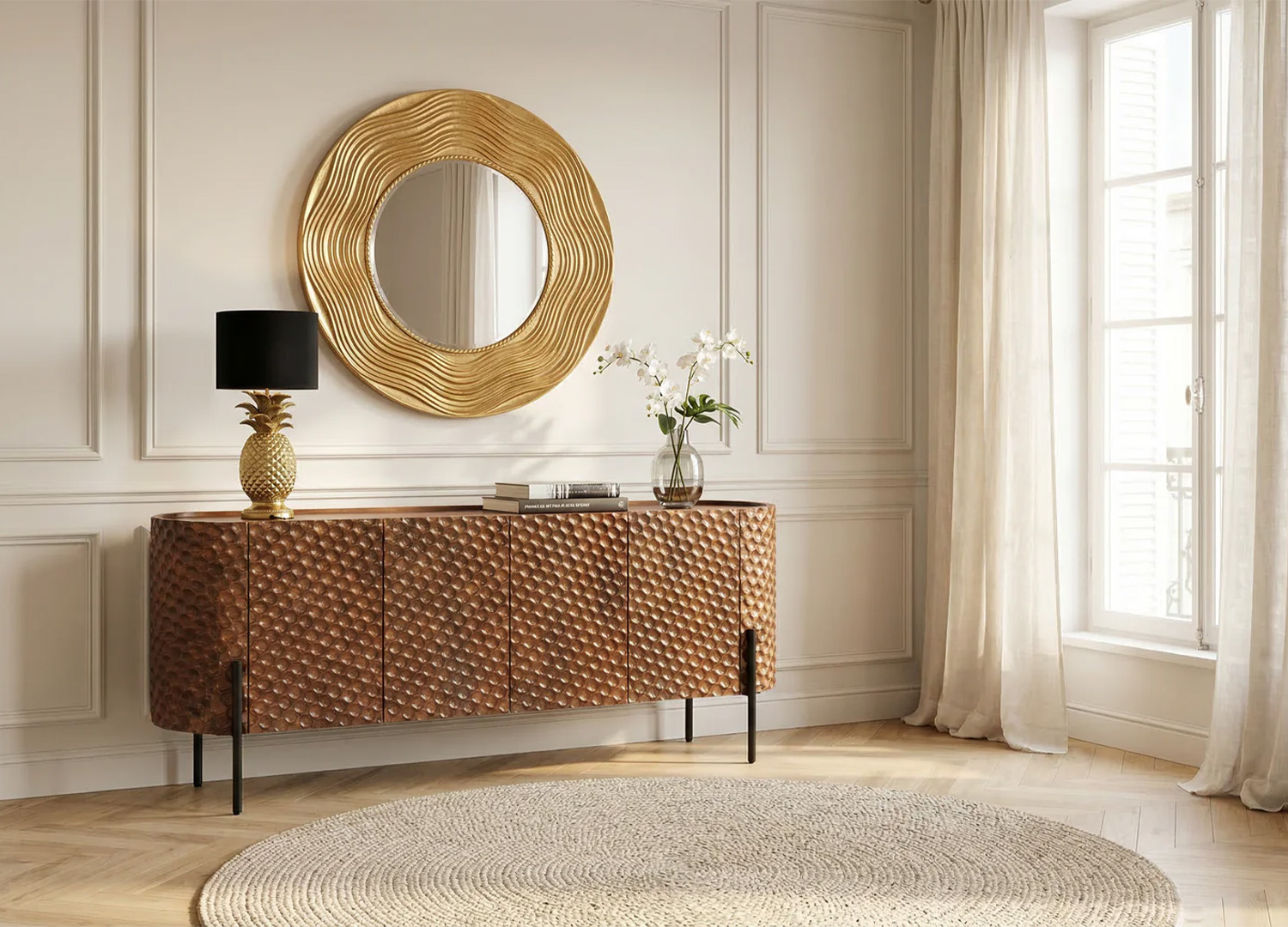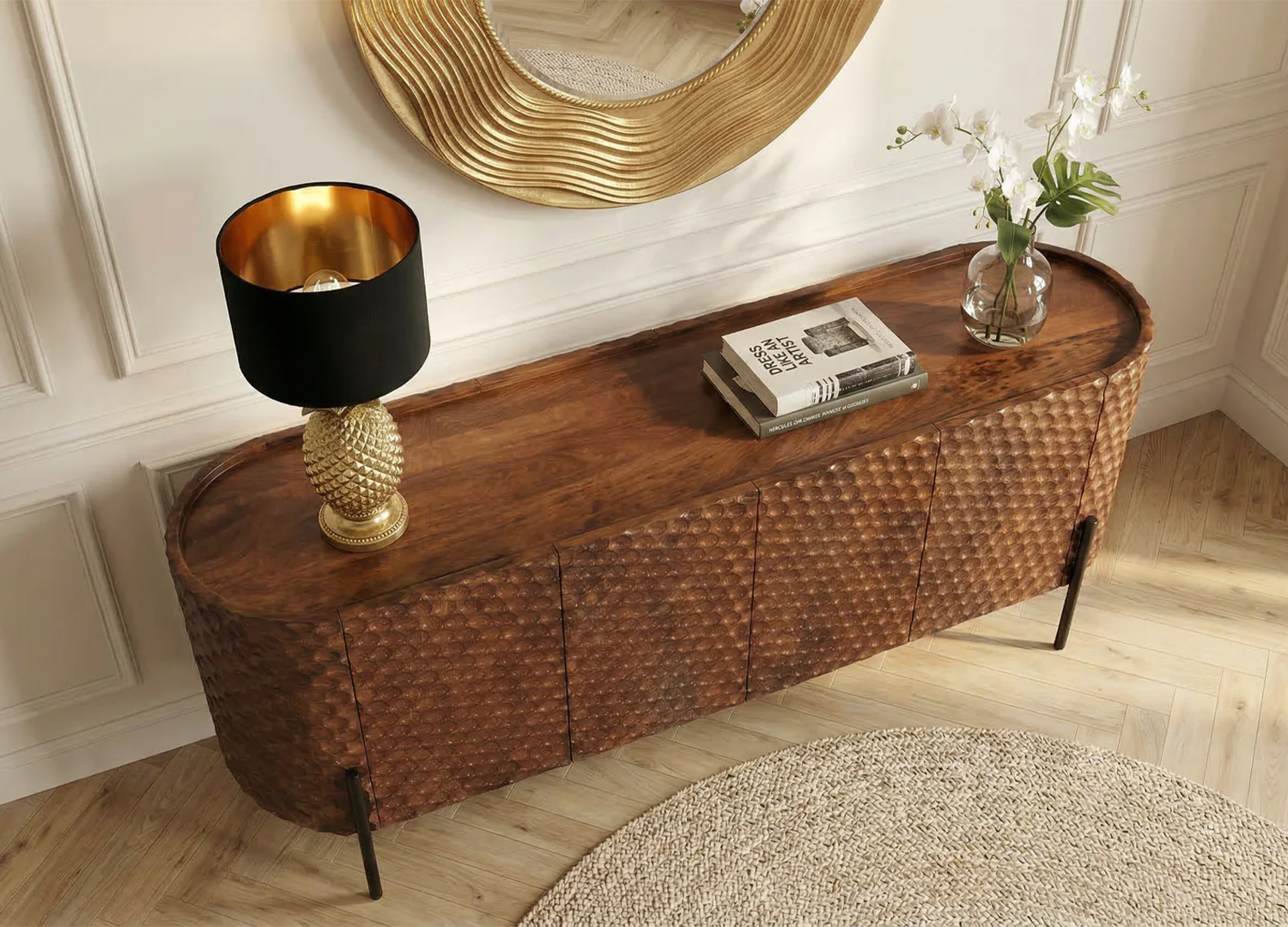 Le buffet MADERA affirme d’emblée une présence décorative rare. Réalisé en manguier massif, il déploie une teinte brune profonde, animée par les nuances naturelles du bois, tandis que sa façade 3D en structure alvéolée donne à l’ensemble un relief presque sculpté. Le motif se prolonge sur les côtés pour composer une ligne continue, enveloppante, au caractère résolument signature.