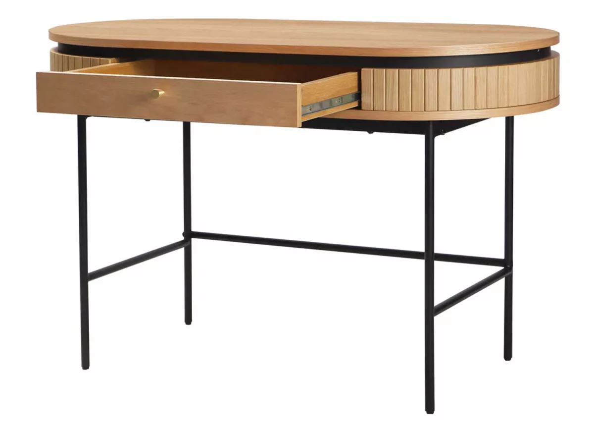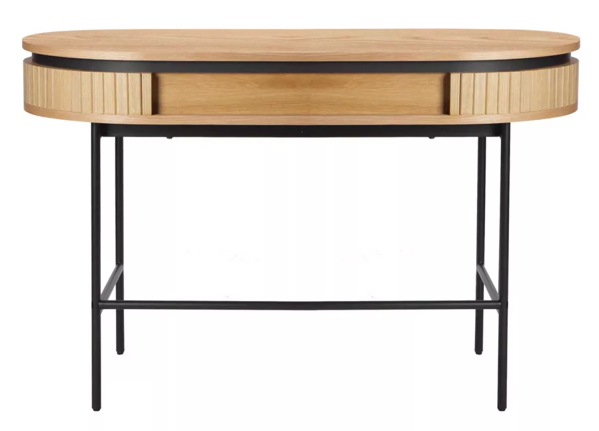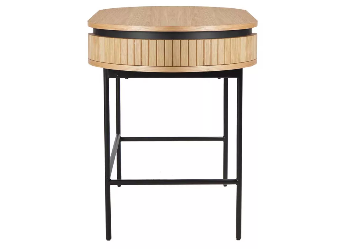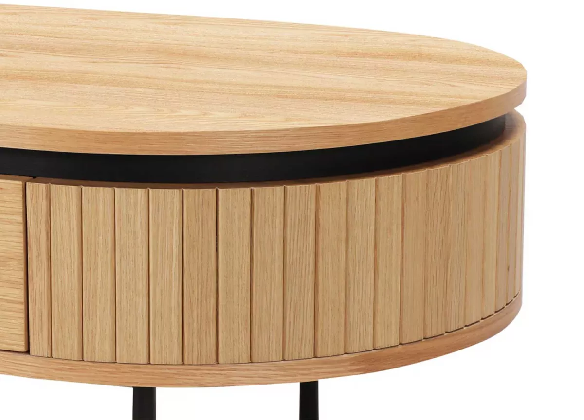 Avec ses courbes délicates et son chêne strié aux nuances vibrantes, ce bureau de 120 cm évoque l’élégance d’une pièce façonnée dans un atelier contemporain. Son unique tiroir, discret mais pratique, accueille vos essentiels sans troubler la légèreté de sa silhouette. Porté par de fines jambes en métal noir, il semble flotter dans l’espace, aérien et raffiné. Il impose sa présence subtile et devient ce trait d’union délicat entre design et poésie du quotidien.