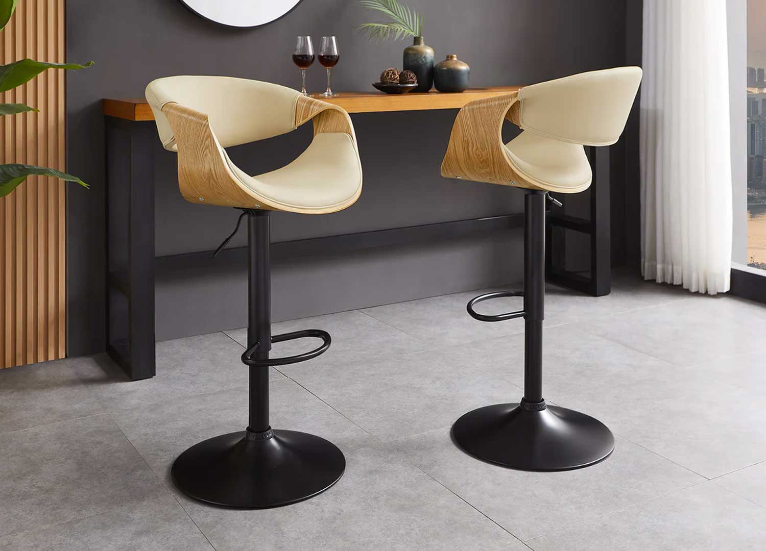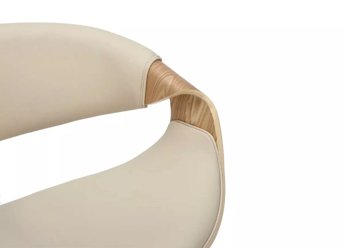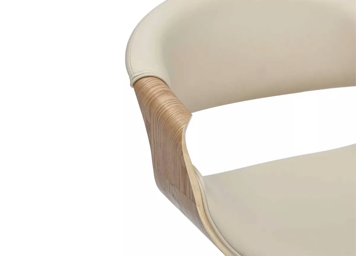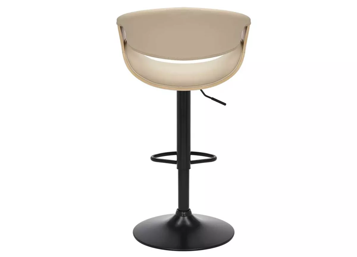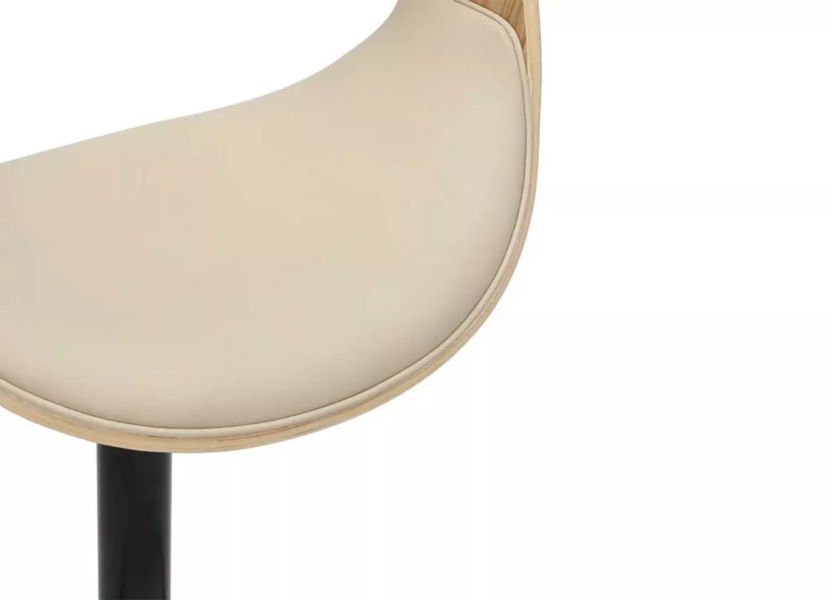 Élégant et confortable, ce tabouret de bar associe la chaleur du plaquage bois de chêne à la douceur du simili cuir beige. Son dossier arrondi et enveloppant assure un maintien agréable, parfait pour profiter d’un repas ou d’un apéritif prolongé. Grâce à son piètement noir avec repose-pieds intégré et son assise réglable en hauteur, il allie design moderne et praticité.