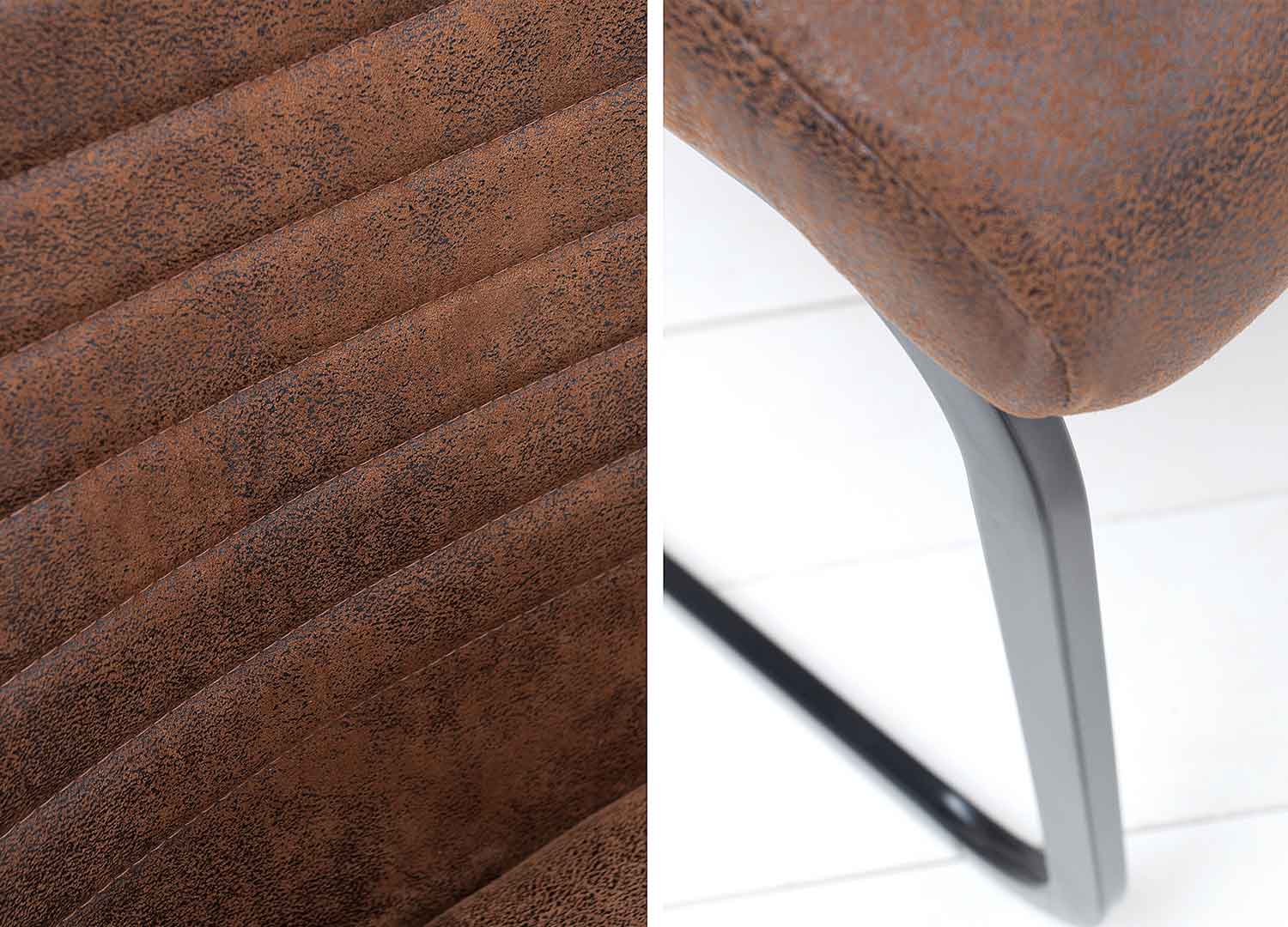 Nos chaises cantilever sont recouvertes d'une microfibre marron vintage qui est douce et accueillante. L'assise vous offre un confort optimal, et la structure métallique noire élégante crée un look industriel dans n'importe quel environnement. Ces chaises constituent un ajout parfait à votre salle à manger avec une table de repas en bois massif ou moderne.