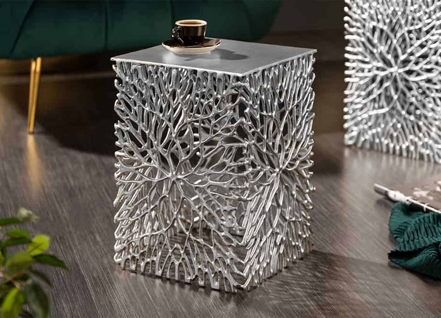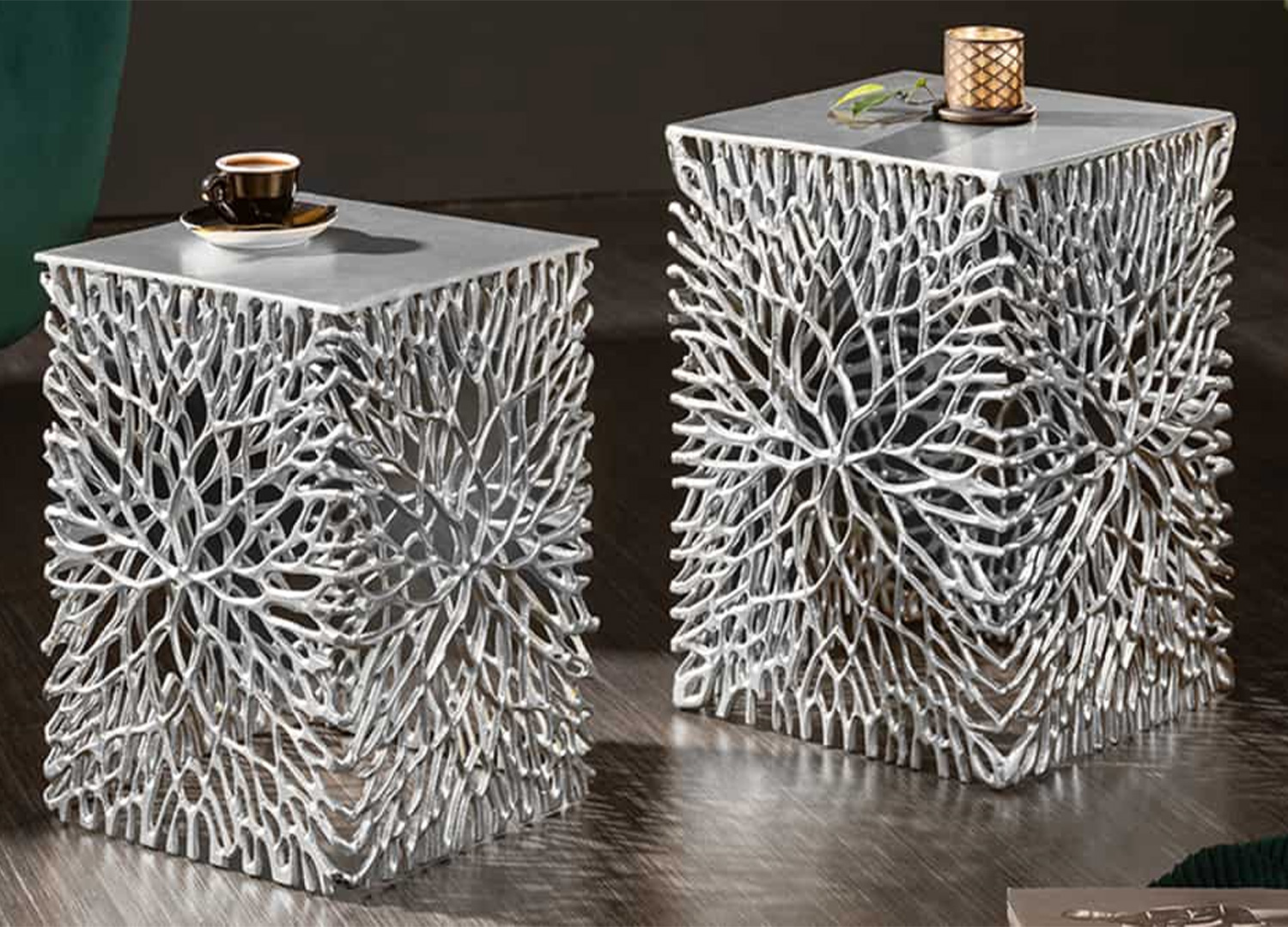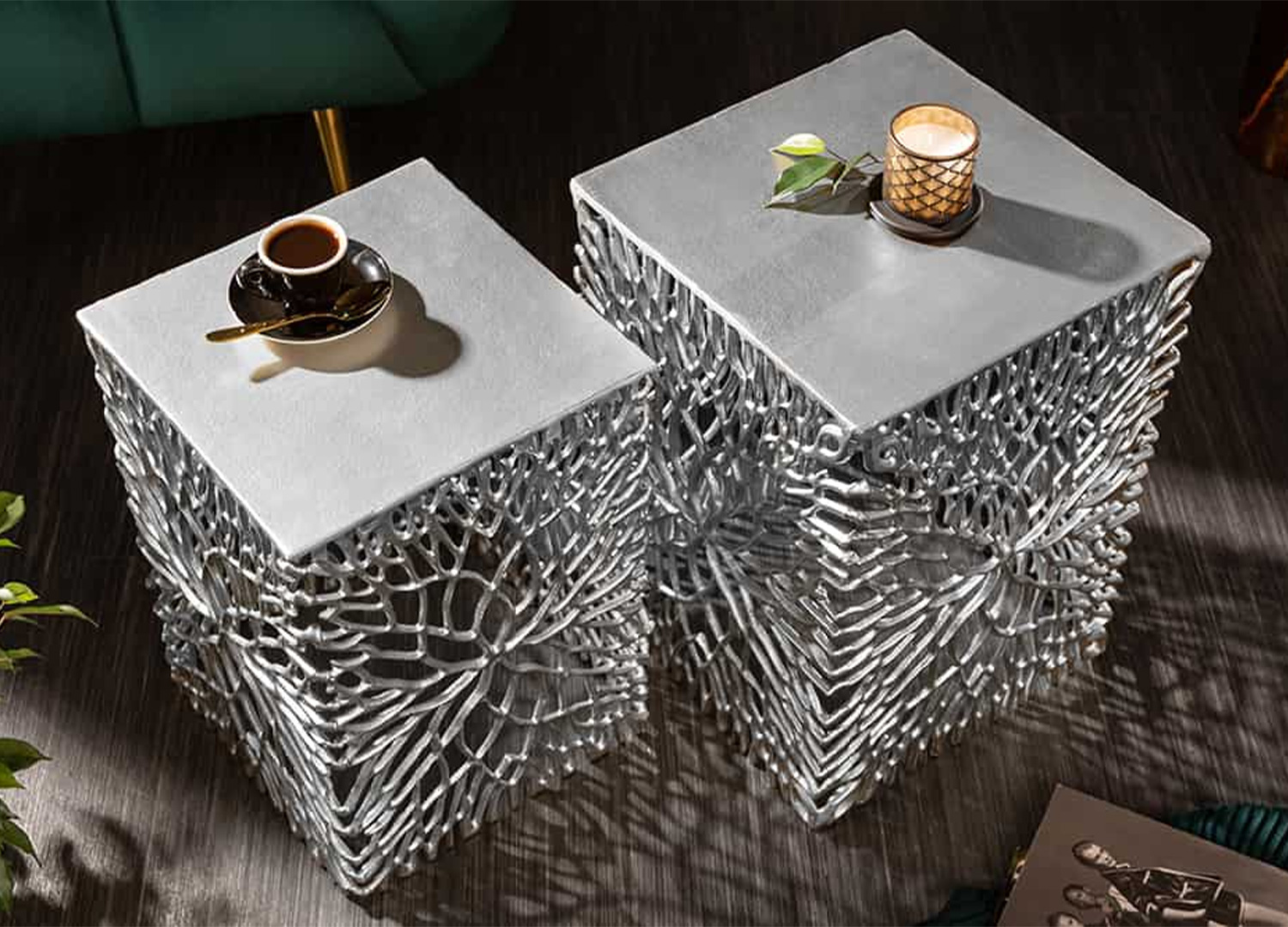 Cet ensemble de 2 tables d’appoint ne se contente pas d’accompagner le décor, il le transforme. Avec leur finition argentée et leur structure ajourée inspirée d’un motif végétal, ces deux pièces dessinent de superbes jeux d’ombre.