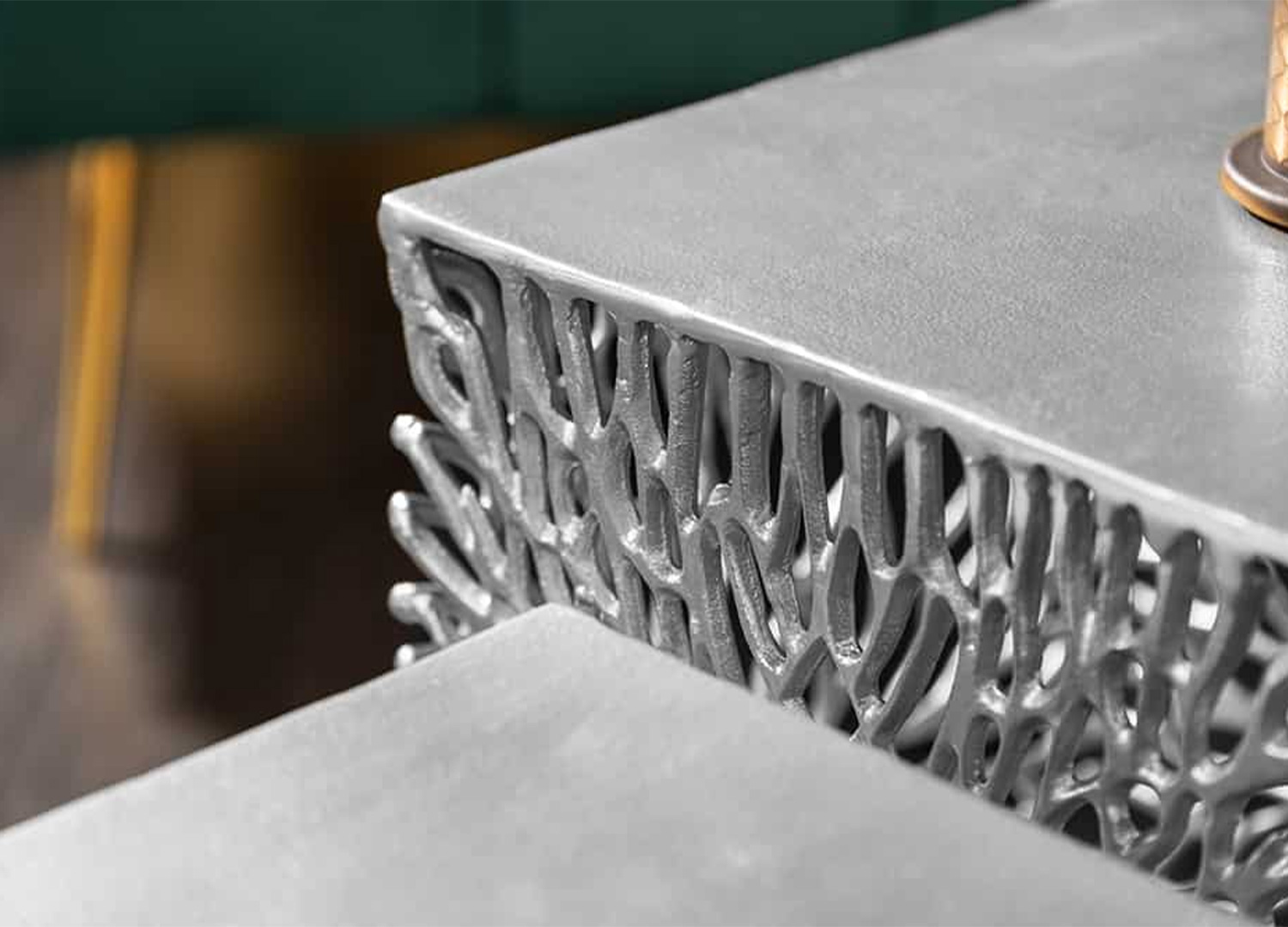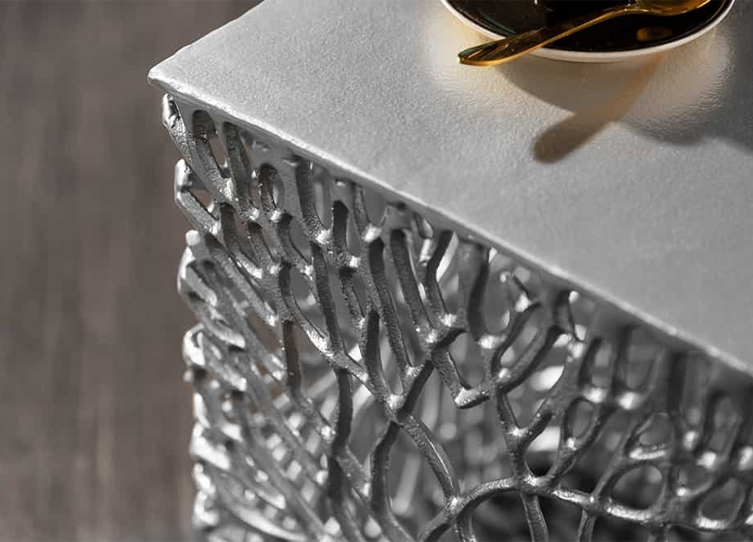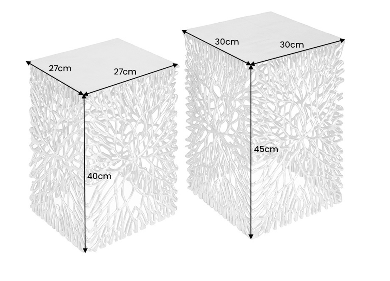 Cet ensemble de 2 tables d’appoint ne se contente pas d’accompagner le décor, il le transforme. Avec leur finition argentée et leur structure ajourée inspirée d’un motif végétal, ces deux pièces dessinent de superbes jeux d’ombre.