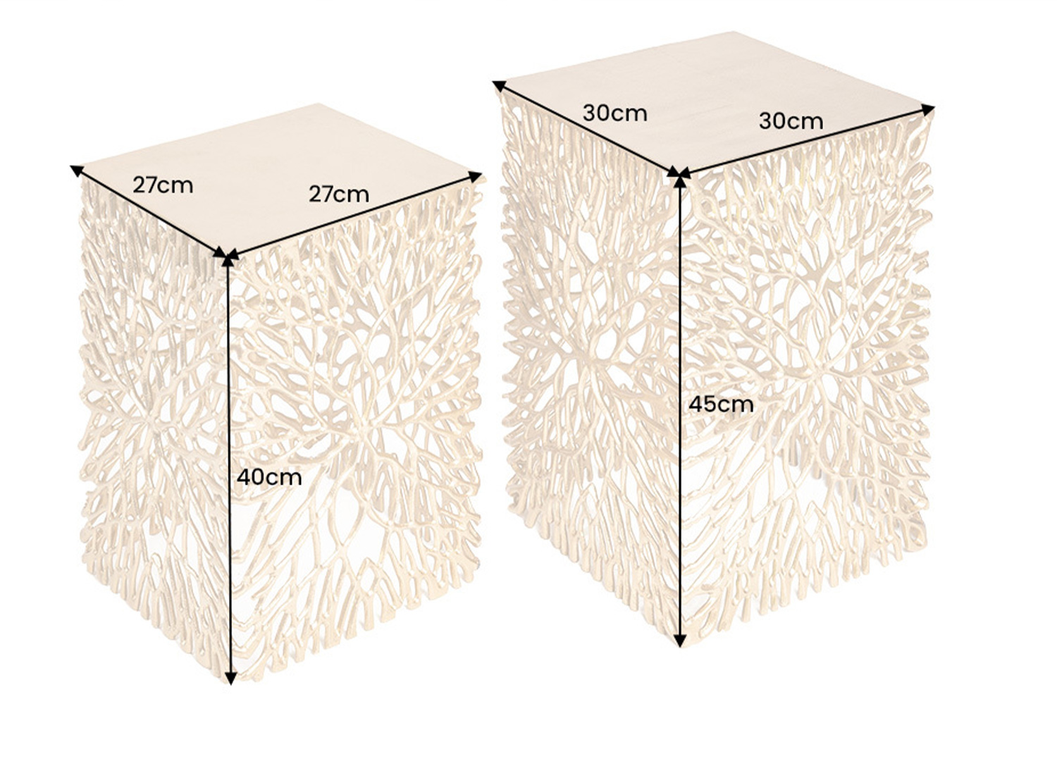 Le duo joue aussi sur un bel effet de rythme grâce à ses deux formats complémentaires. La plus grande table mesure 30 x 30 x 45 cm et la seconde 27 x 27 x 40 cm. Ensemble ou séparées, elles s’utilisent facilement en bout de canapé, près d’un fauteuil ou dans un coin lecture, pour accueillir une lampe ou quelques objets déco.