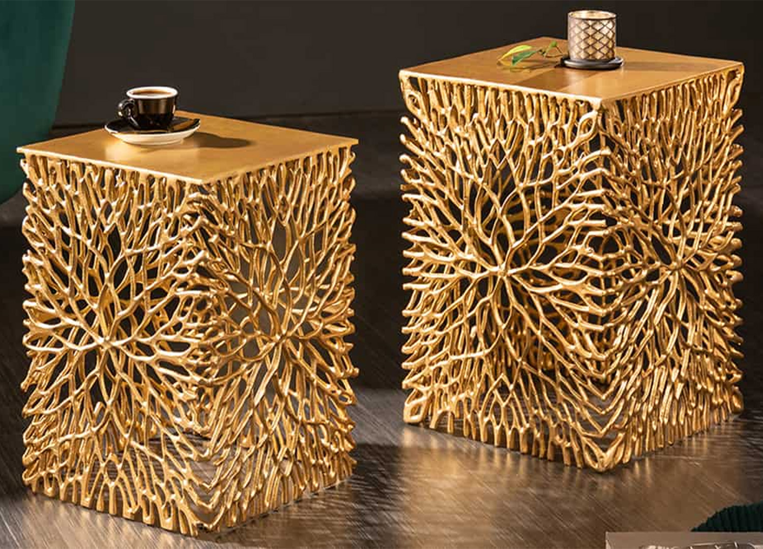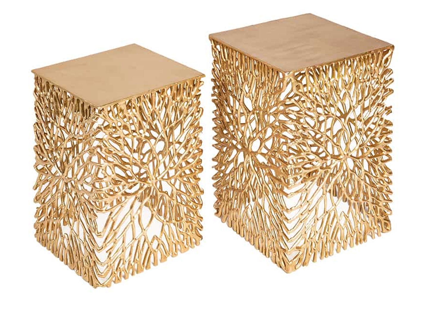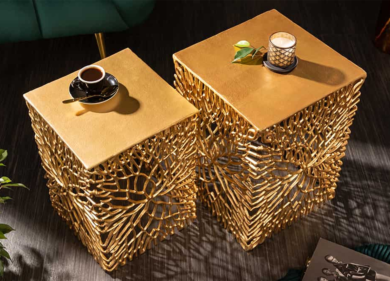 Cet ensemble de 2 tables d’appoint ne se contente pas d’accompagner le décor, il le transforme. Avec leur finition dorée et leur structure ajourée inspirée d’un motif végétal, ces deux pièces dessinent de superbes jeux d’ombre.