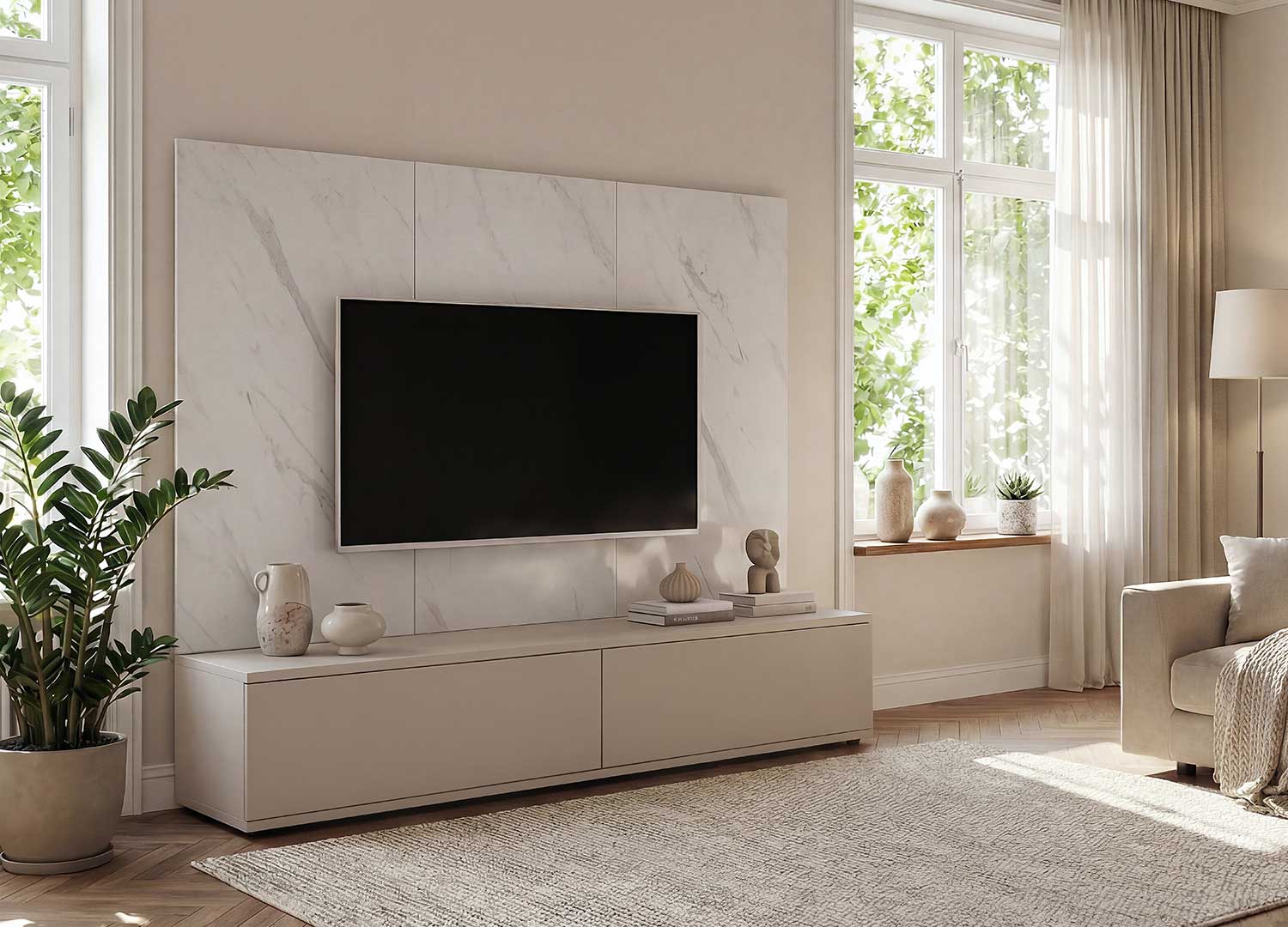 Ici, le style va droit au but. Cet ensemble TV mise sur une silhouette nette et un panneau mural imitation marbre blanc qui habille immédiatement l’espace. Son décor minéral apporte du relief sans alourdir la pièce, tandis que le meuble bas prolonge l’ensemble avec une ligne sobre, actuelle et parfaitement équilibrée. Le résultat : un meuble TV au look chic, lumineux et résolument contemporain.