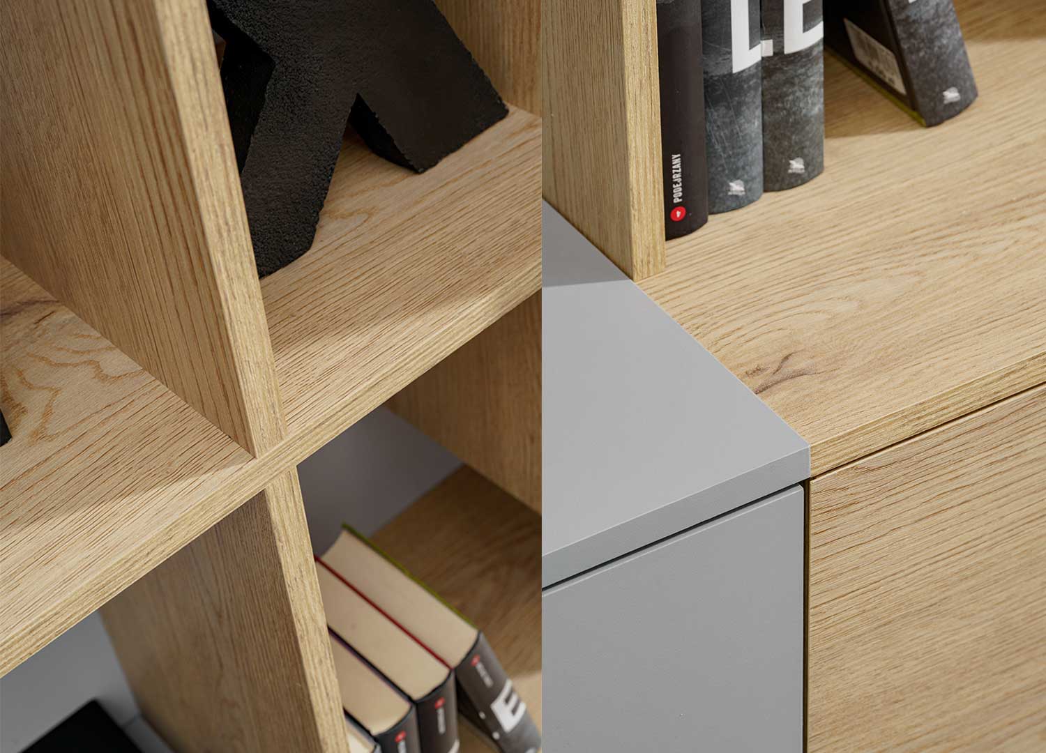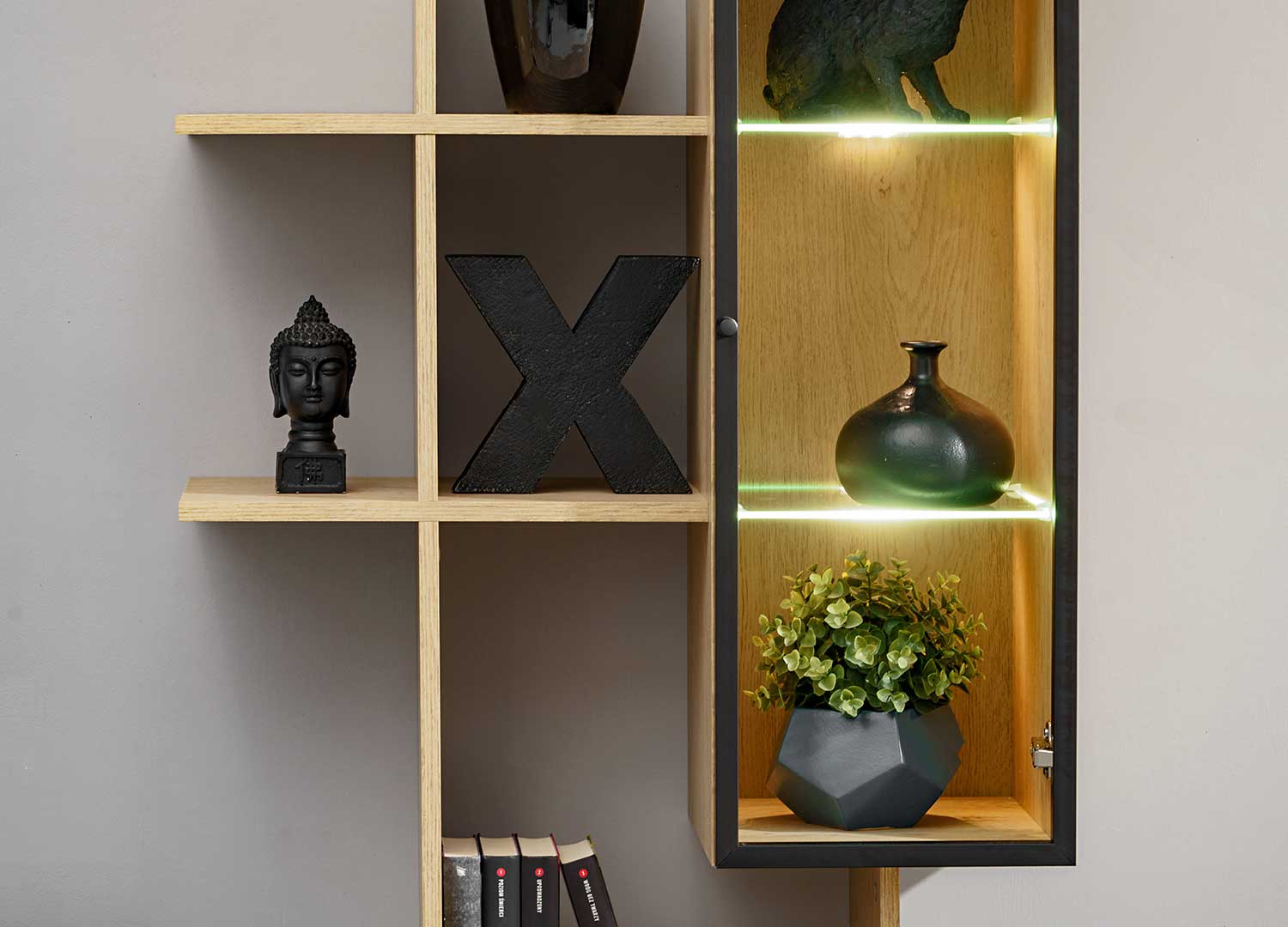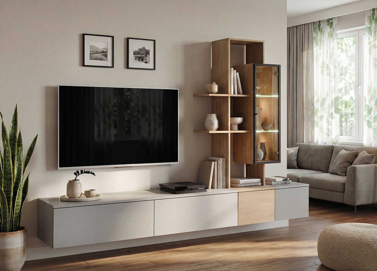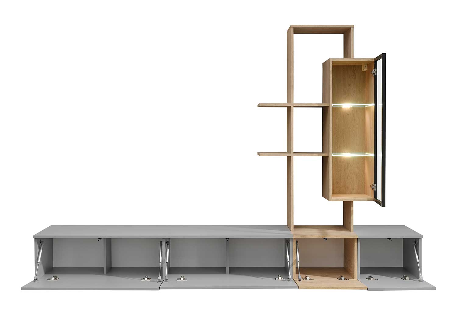 Cet ensemble TV gris et chêne présente un design moderne et fonctionnel, adapté à un intérieur contemporain. La partie supérieure se compose d’une vitrine et d’une étagère murale de forme irrégulière, qui structurent l’ensemble et apportent un espace d’exposition supplémentaire. À l’intérieur de la vitrine, deux étagères en verre sont intégrées et mises en valeur par un éclairage LED, pratique pour exposer des objets décoratifs.