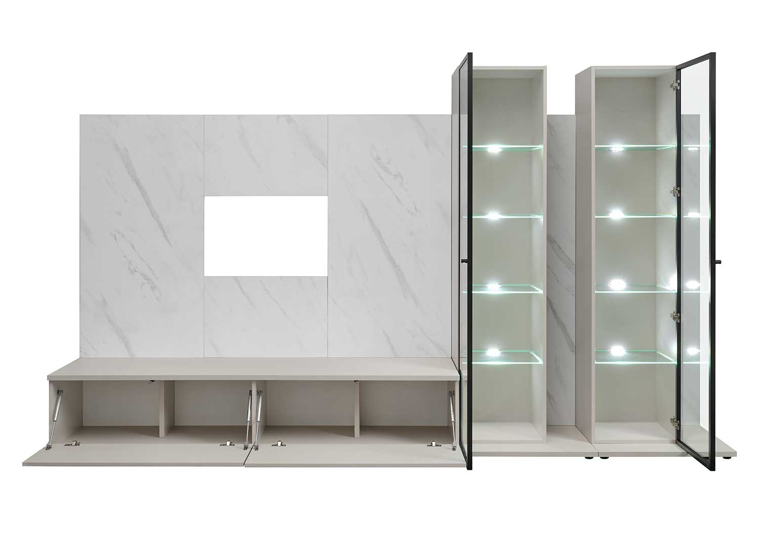 Ensemble TV design avec vitrines en verre et LED 300 cm