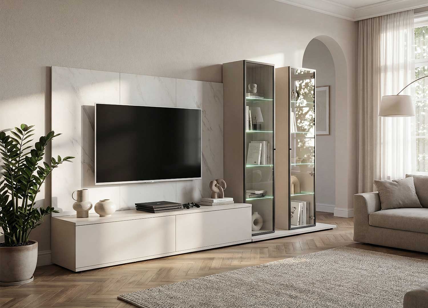 Un ensemble TV qui offre beaucoup de rangement tout en apportant un esprit moderne dans le salon.