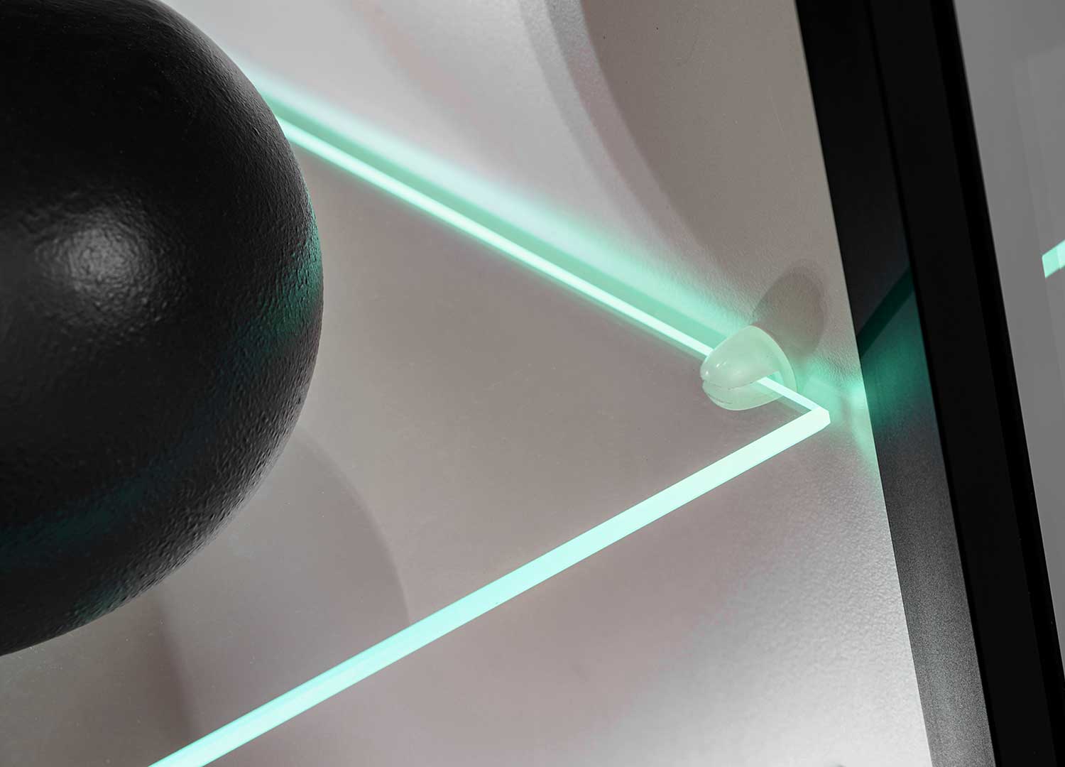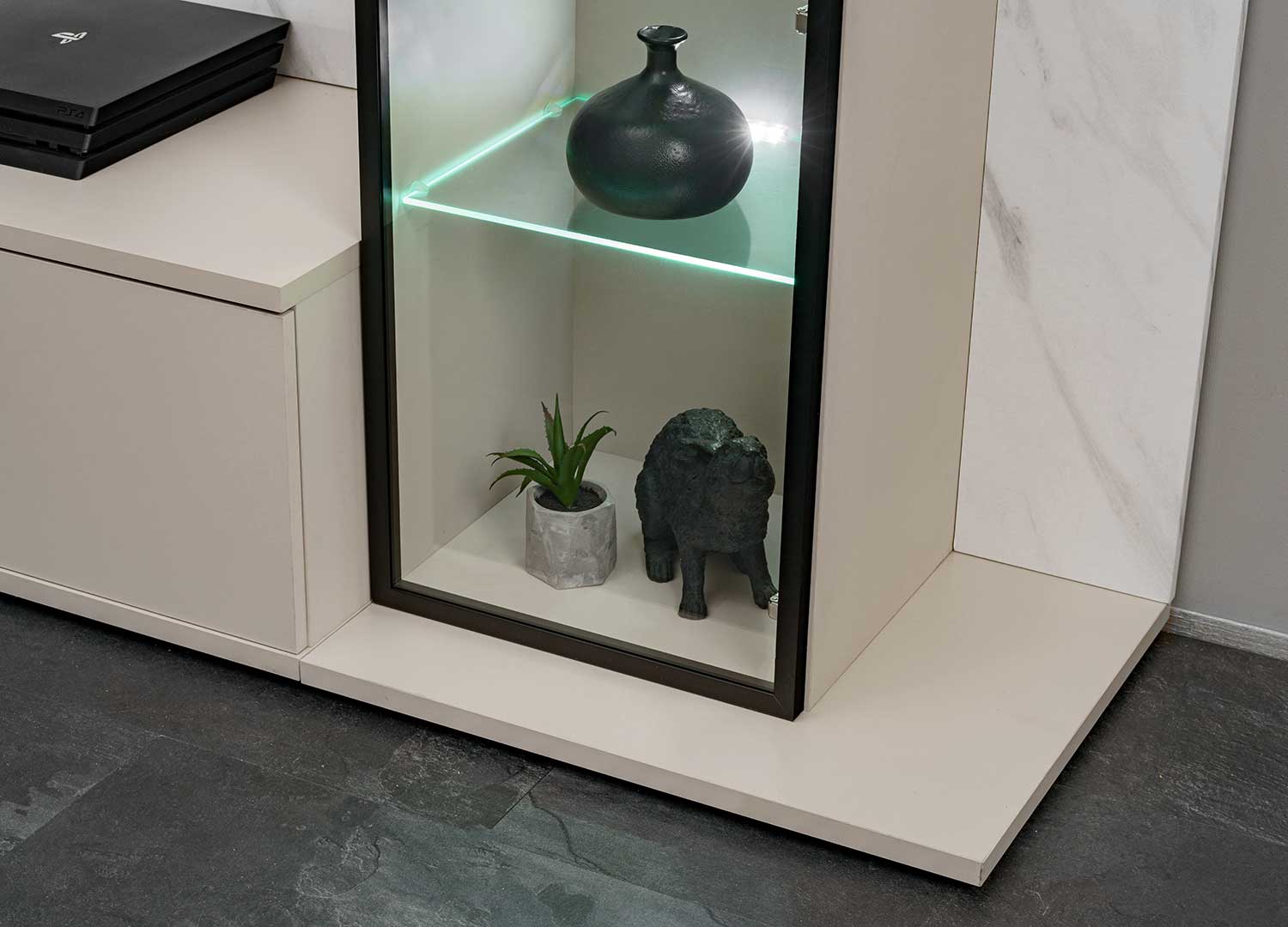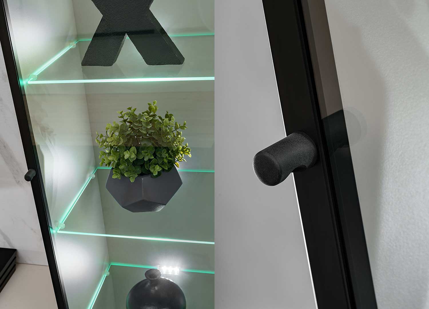 À droite, la vitrine vitrée avec cadre noir vient structurer l’ensemble avec plus de caractère. Son intérieur se compose de quatre étagères en verre, mises en valeur par un éclairage LED qui souligne les objets exposés.