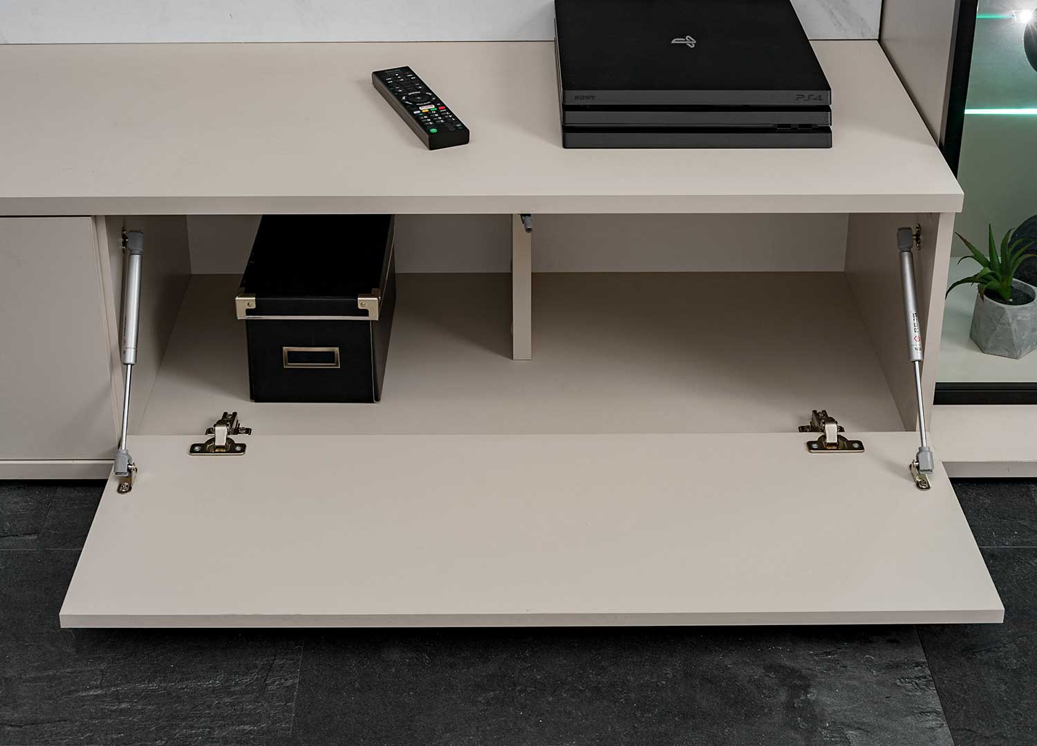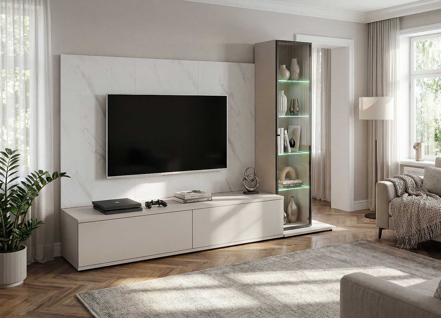 Cet ensemble TV affirme son style dès le premier regard. Le panneau mural imitation marbre blanc donne du relief à l’espace et installe une allure contemporaine et lumineuse. En partie basse, le meuble TV reprend cette ligne épurée avec deux rabats qui dissimulent chacun deux compartiments, parfaits pour garder vos appareils, accessoires et indispensables du salon bien organisés sans rien laisser paraître.