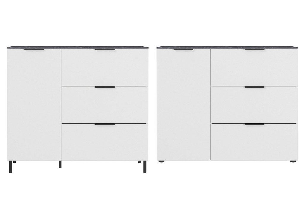 Une commode au corps blanc accompagné d'un plateau gris effet marbre, avec 3 tiroirs ainsi que 1 porte pour un rangement optimisé dans un salon, une entrée ou une chambre. Un grand meuble, à l'allure sobre et élégante pour une ambiance cosy, qui existe aussi en version 3 tiroirs pour avoir plus d'espaces de rangement. Un espace de rangement non-négligeable pour un style contemporain omniprésent dans votre intérieur, en procurant espace et décoration à celui-ci. Associez cette commode à tiroir avec d'autres meubles de la même collection pour un ensemble de meubles blancs homogènes.