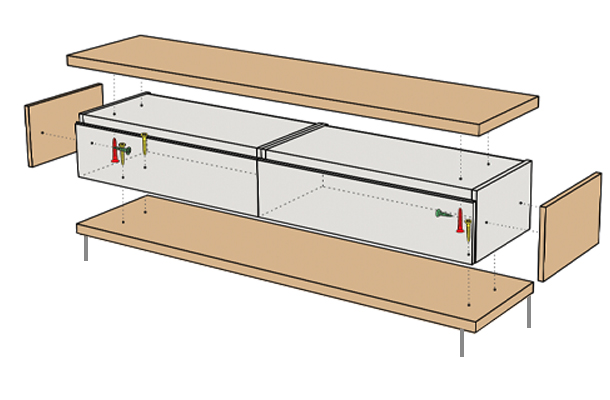 Une fois vos modules assemblés entre eux, il vous faudra les assembler à la base avec piétement, et par la suite à la structure du meuble (planches de côtés et du dessus) comme ceci :