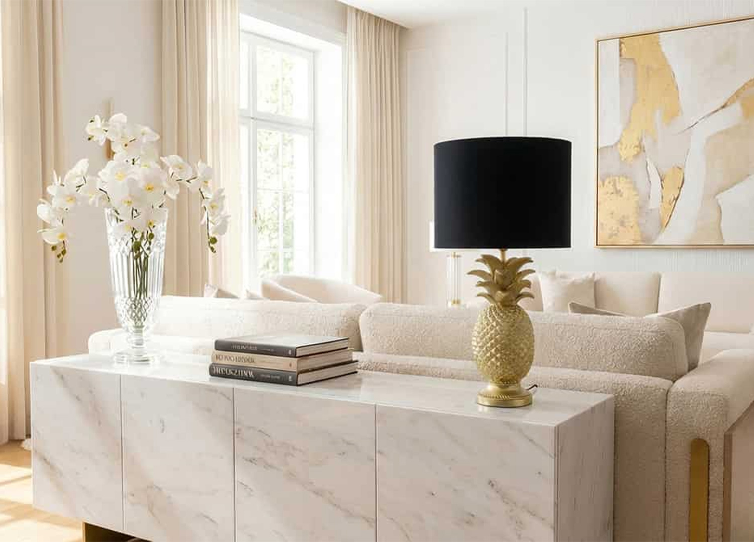 Avec son pied en forme d’ananas et son fini doré lumineux, la lampe de table exotica insuffle immédiatement du caractère à la pièce. Son abat-jour noir, subtilement doré à l’intérieur, crée un contraste chic et donne à l’ensemble une allure aussi élégante qu’originale. C’est une lampe qui attire le regard, réchauffe l’atmosphère et transforme une simple console, une table d’appoint ou un bureau en décor soigné.