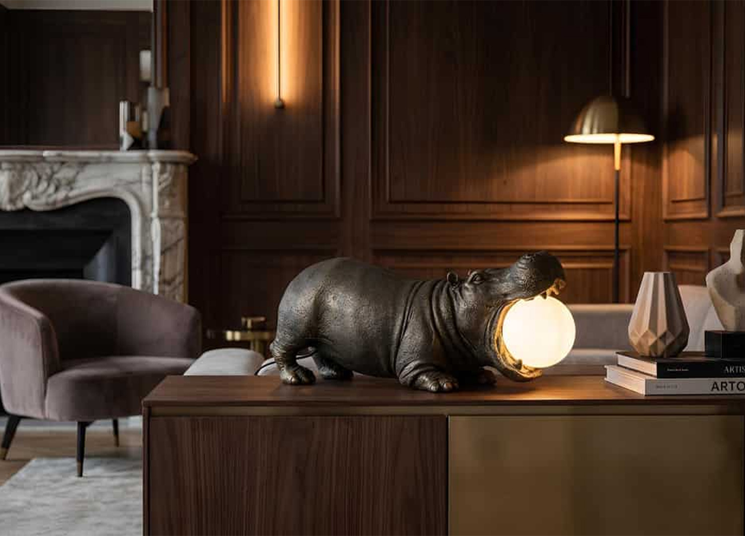 Avec sa silhouette d’hippopotame noir et bronze et son globe lumineux délicatement coincé entre ses mâchoires, cette lampe de table apportera à l’intérieur une présence aussi singulière que captivante. À mi-chemin entre sculpture décorative et luminaire décalé, elle attire immédiatement le regard et transforme un meuble en véritable scène de caractère.