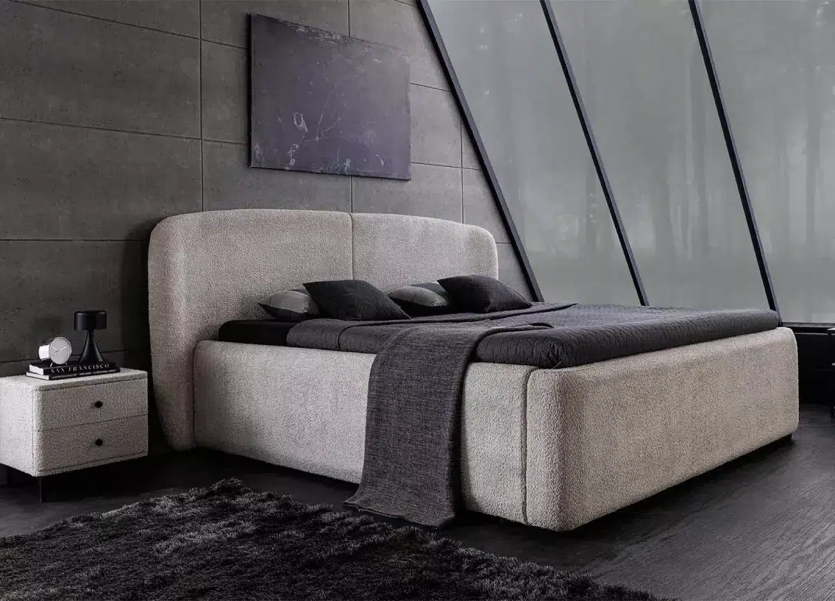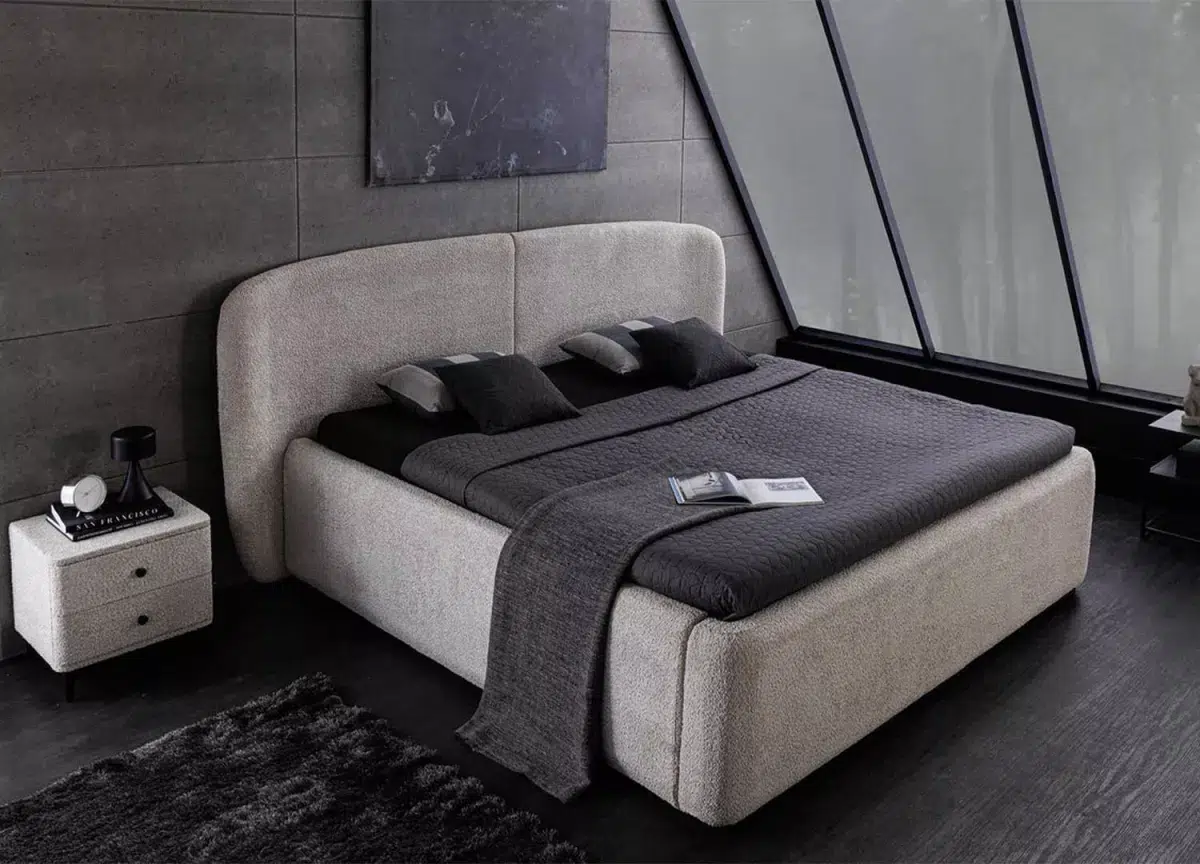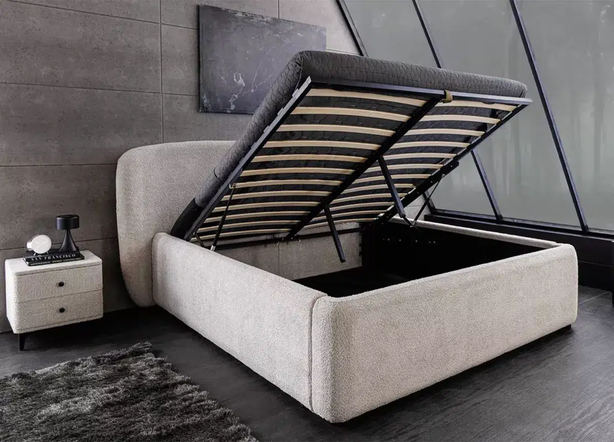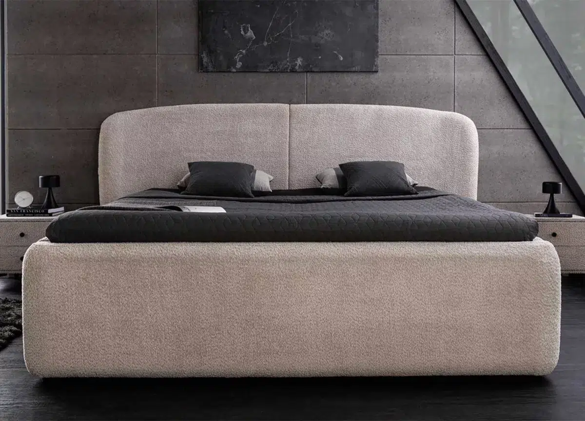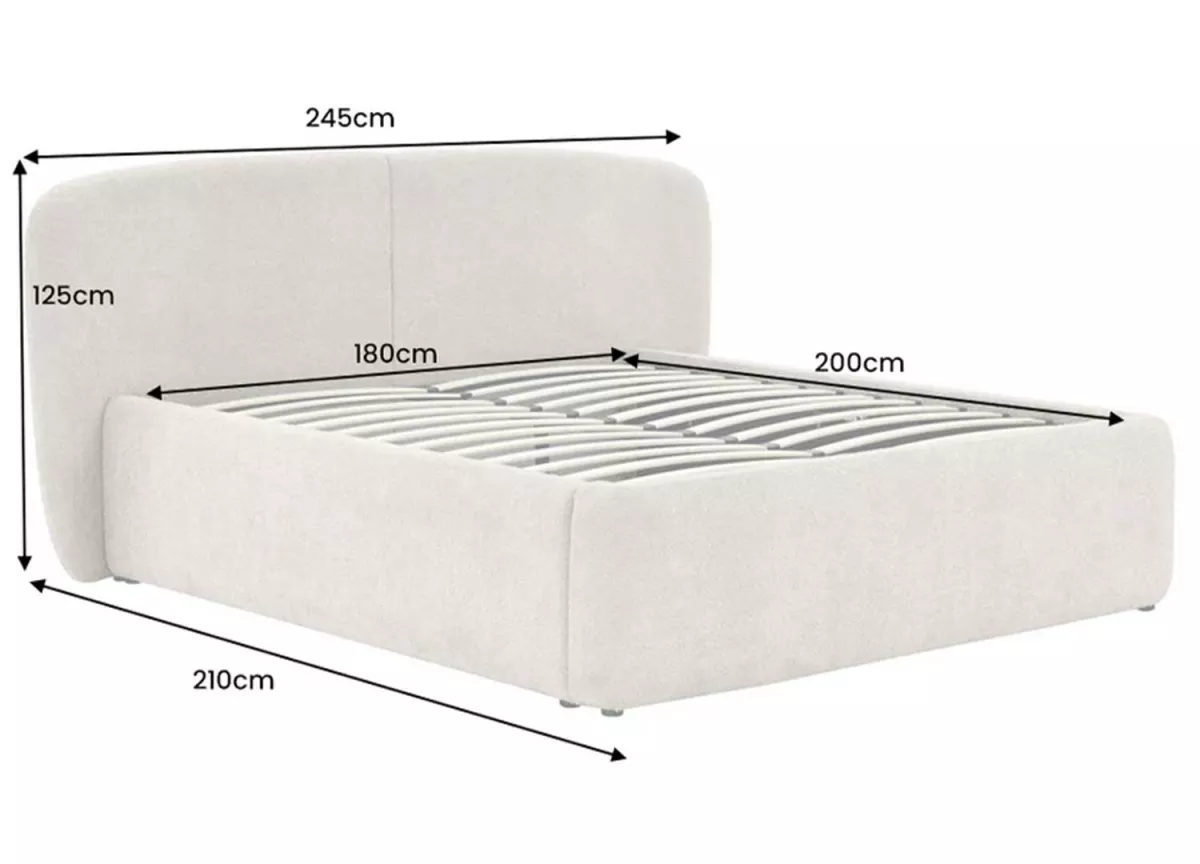 Élégance et praticité réunies : ce lit double 180 x 200 cm en tissu bouclé grège séduit par son allure douce et contemporaine. Sa tête de lit arrondie invite au cocooning, tandis que son sommier relevable cache un vaste espace de rangement, discret et ingénieux. Le confort rencontre ici le design pour sublimer vos nuits comme vos journées.