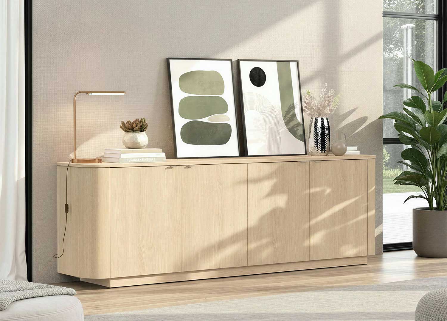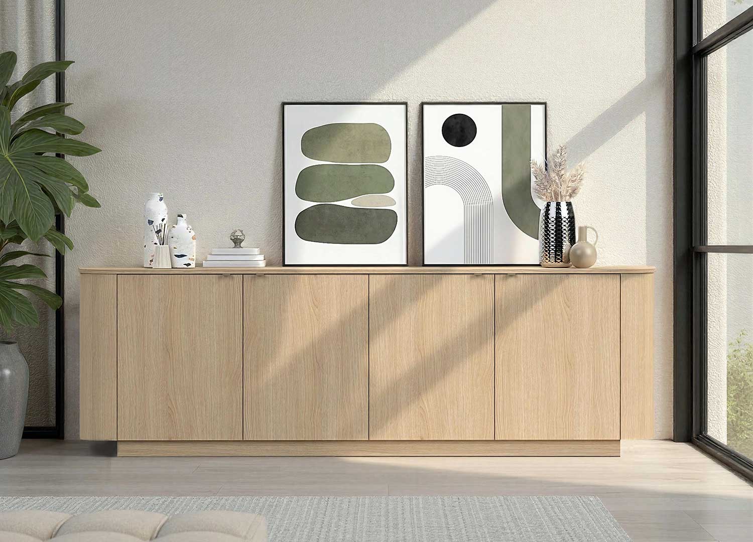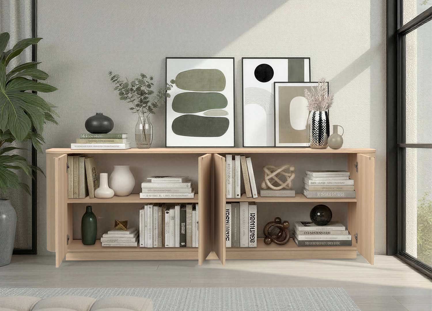 Long meuble buffet 230 cm chêne naturel 4 portes à bords arrondis Almora