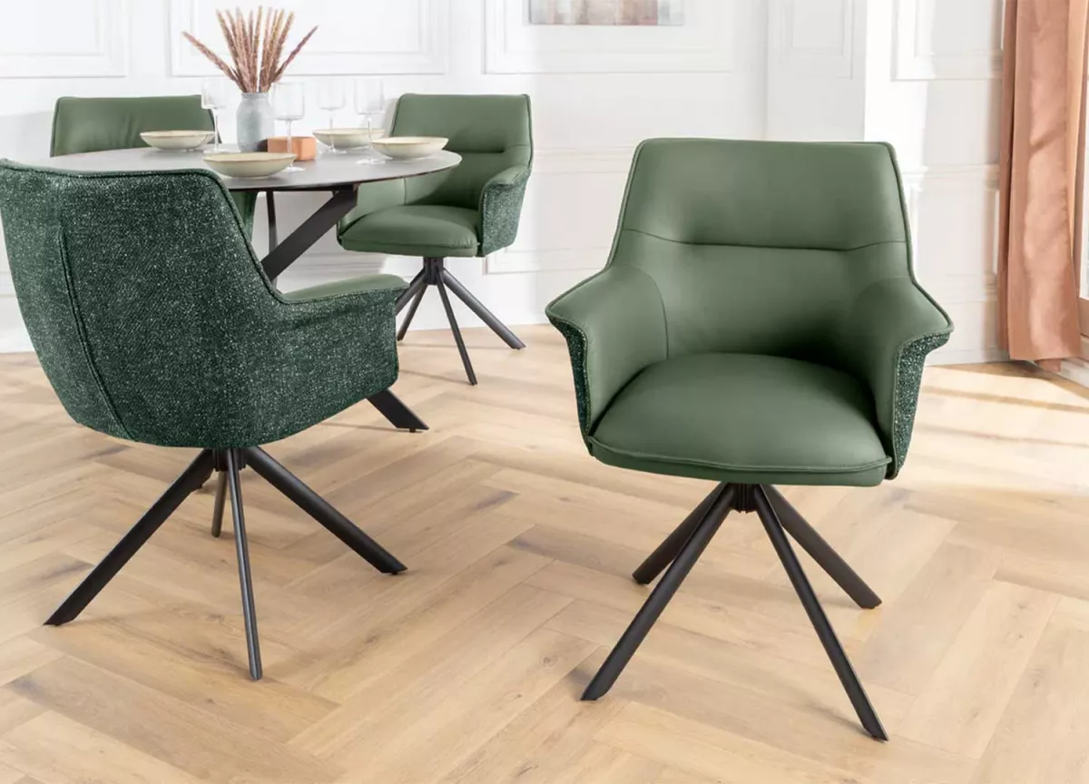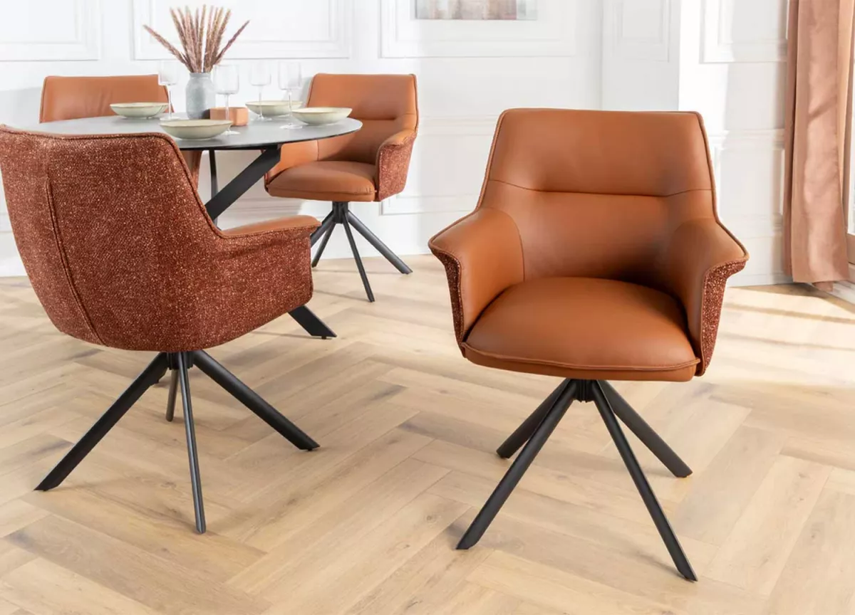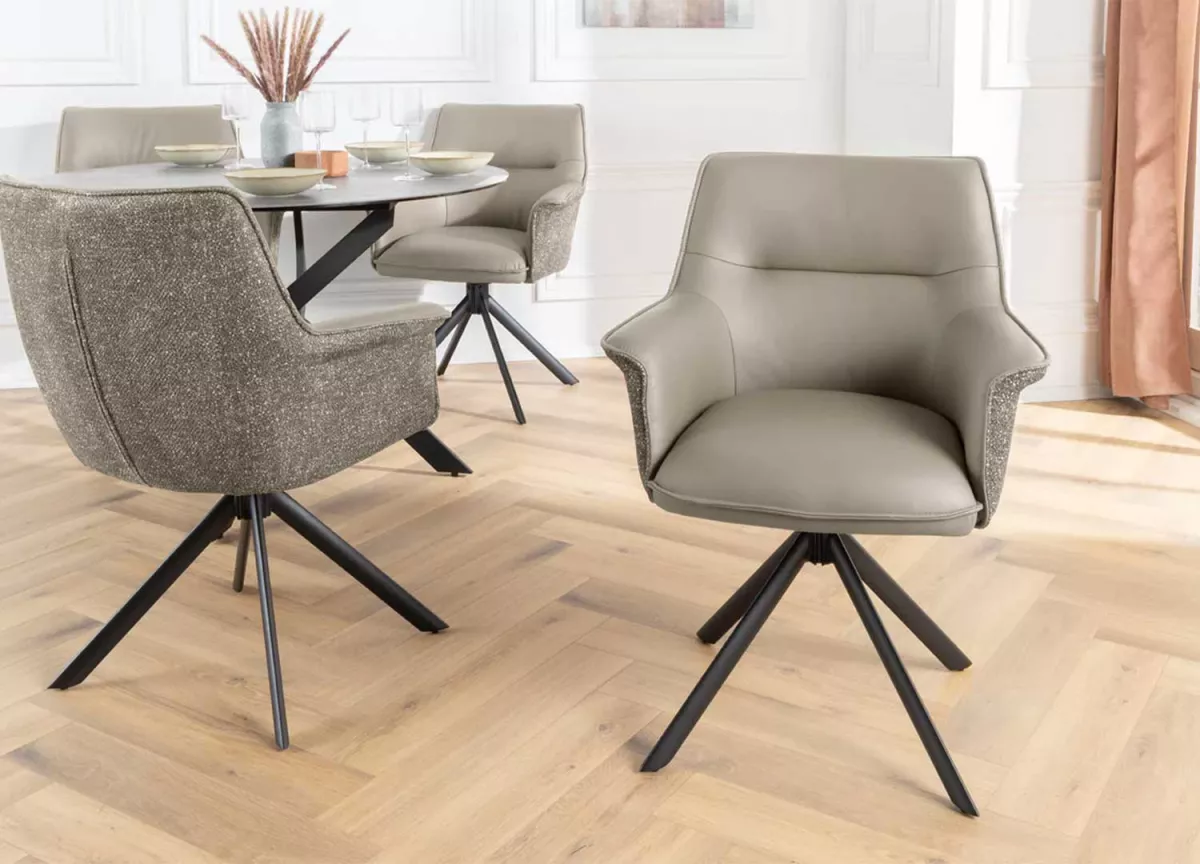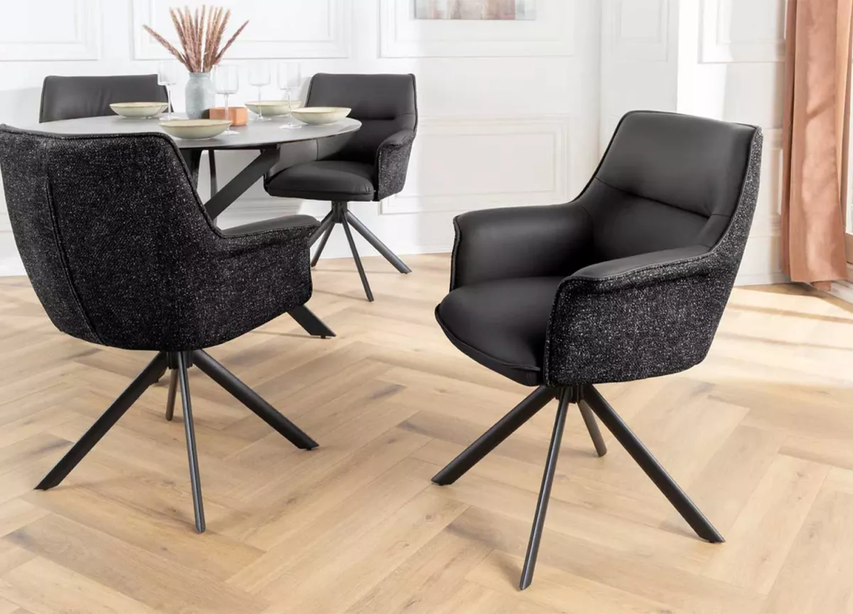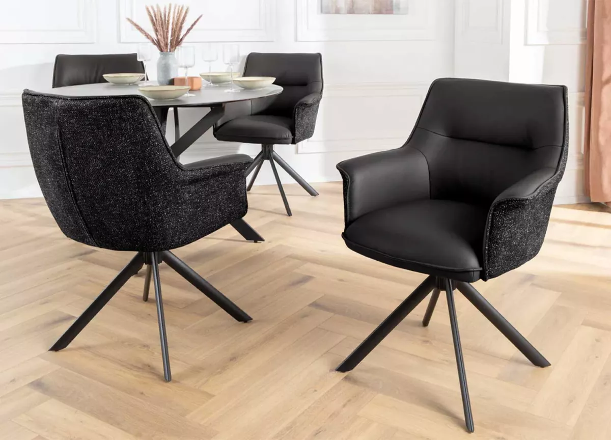 Ces chaises ne se contentent pas d’habiller votre pièce — elles lui donnent du style. Leur assise en cuir souple épouse les formes pour un confort tout en douceur, tandis que la coque extérieure en tissu chenille apporte une touche de chaleur et de texture. Le piétement en métal noir, stable et graphique, ancre l’ensemble dans une esthétique contemporaine. Et pour la touche pratique : la rotation à 180° avec retour automatique, parfaite pour garder le mouvement fluide et naturel au quotidien.
