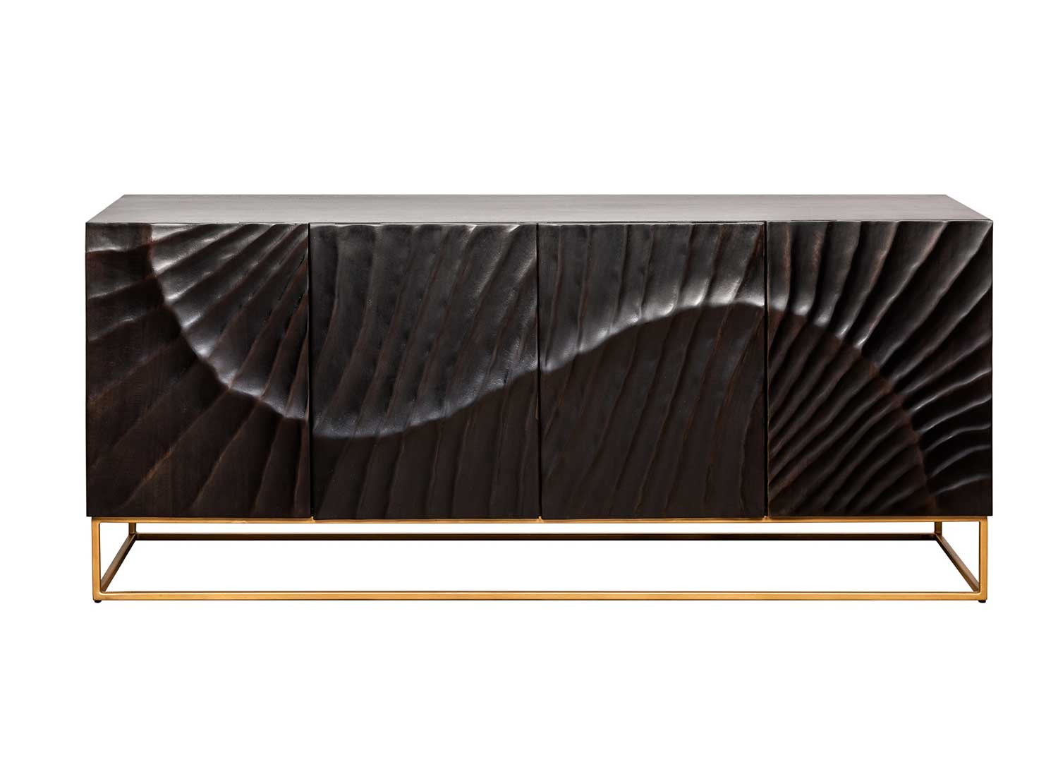 Un meuble buffet en bois massif avec pieds en métal doré d'une longueur de 177 cm aux nombreux rangements qui permettront un agencement efficace de votre vaisselle, couverts ou autre accessoires. À la façon d'une œuvre d'art, ce grand buffet diffuse une atmosphère artistique incomparable. Ce buffet contemporain en bois de manguier teinté noir est idéal pour une salle à manger de type contemporaine ou encore rétro.