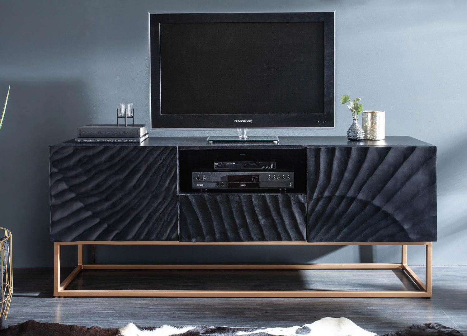 Ce meuble télé de 160 cm en bois massif de manguier noir avec pieds en métal laqué doré est idéal pour un salon contemporain. Ce meuble accepte un charme et une structure artistique unique. Un meuble tv qui, en plus d'accepter votre télévision, permettra de décorer votre salon de sa touche esthétique. À la façon d'une œuvre d'art, il diffusera une atmosphère artistique incomparable.