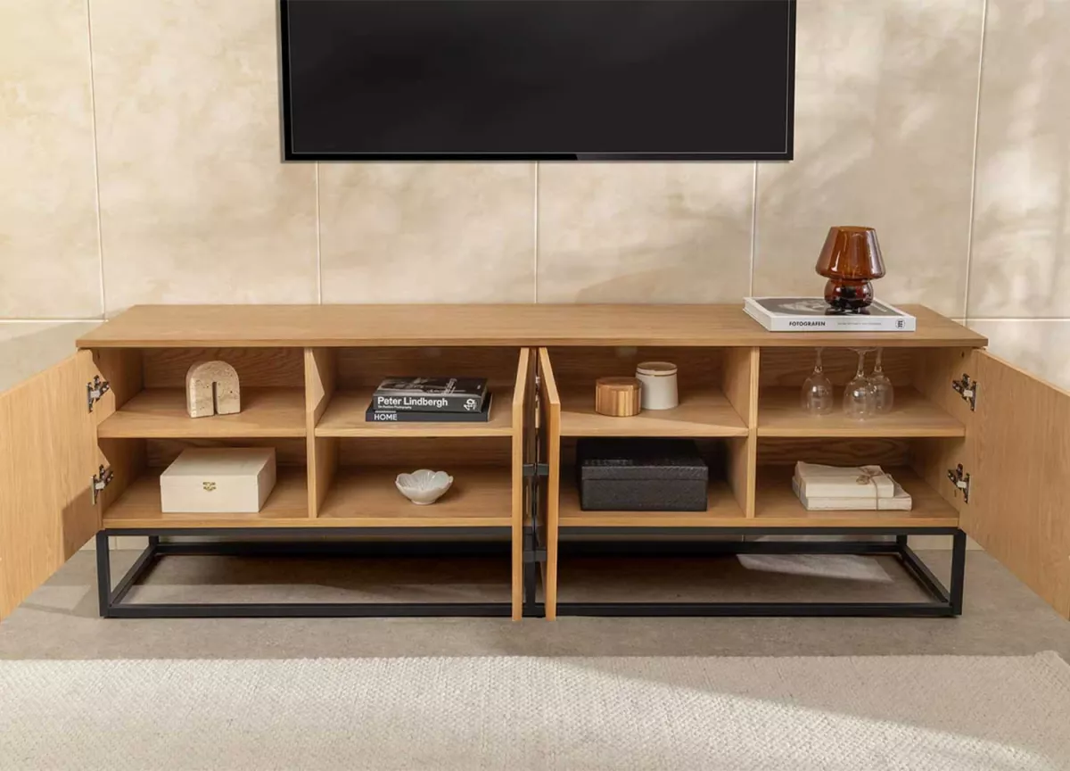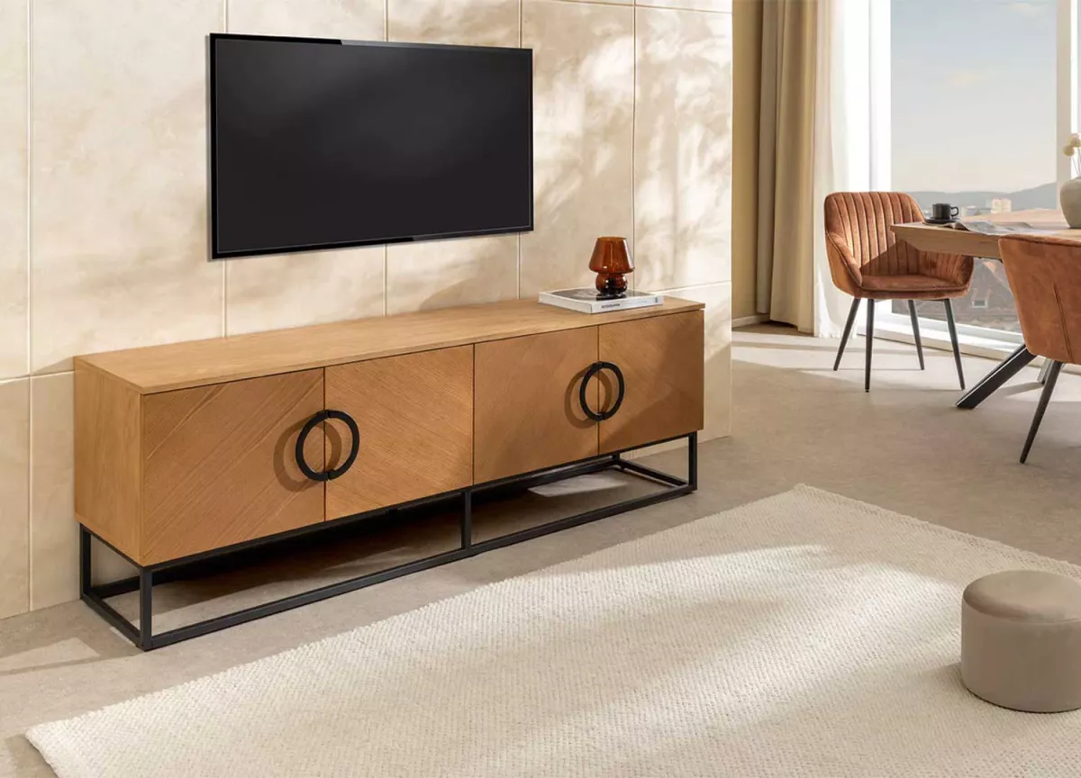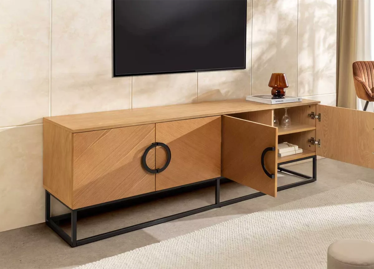 Sous ses allures sages, ce meuble TV de 180 cm cache un vrai tempérament. Son placage chêne clair capte la lumière, ses lignes se tendent, puis s’adoucissent, et son piétement en métal noir le fait presque léviter. Derrière ses portes aux grandes poignées graphiques, un monde bien rangé : câbles, box et secrets du salon disparaissent avec élégance. À mi-chemin entre nature et design, il impose sa présence sans bruit — juste une note de calme et de caractère au cœur du séjour.