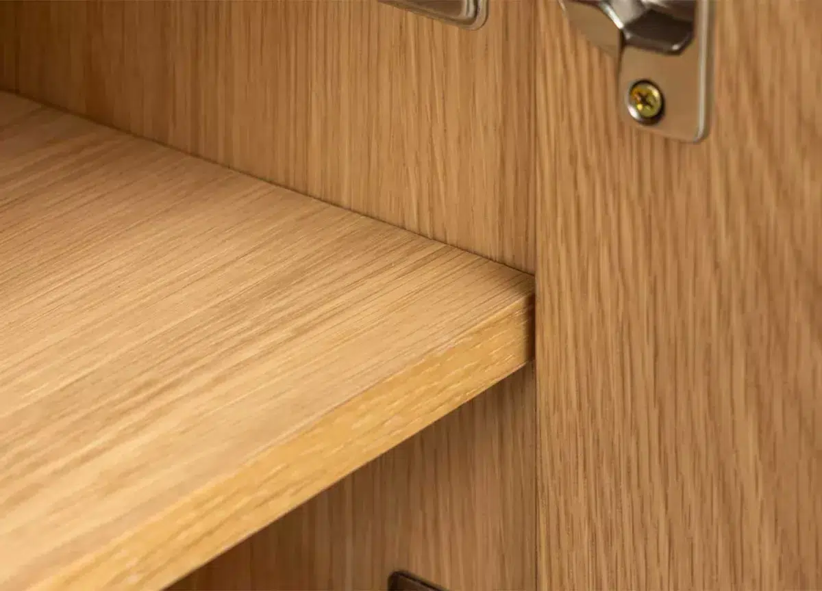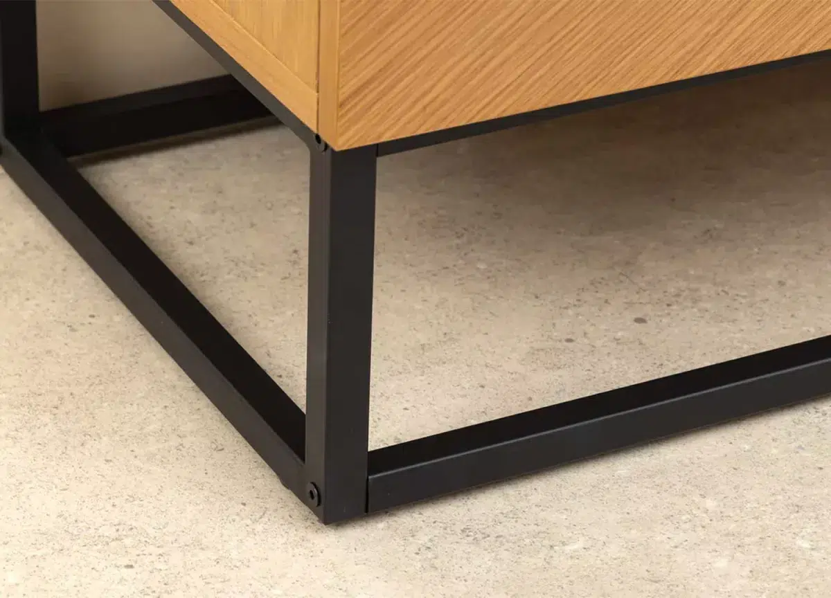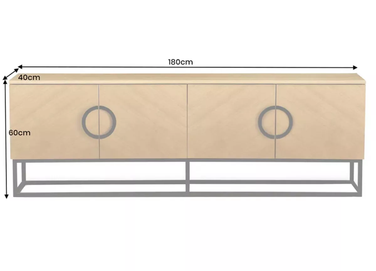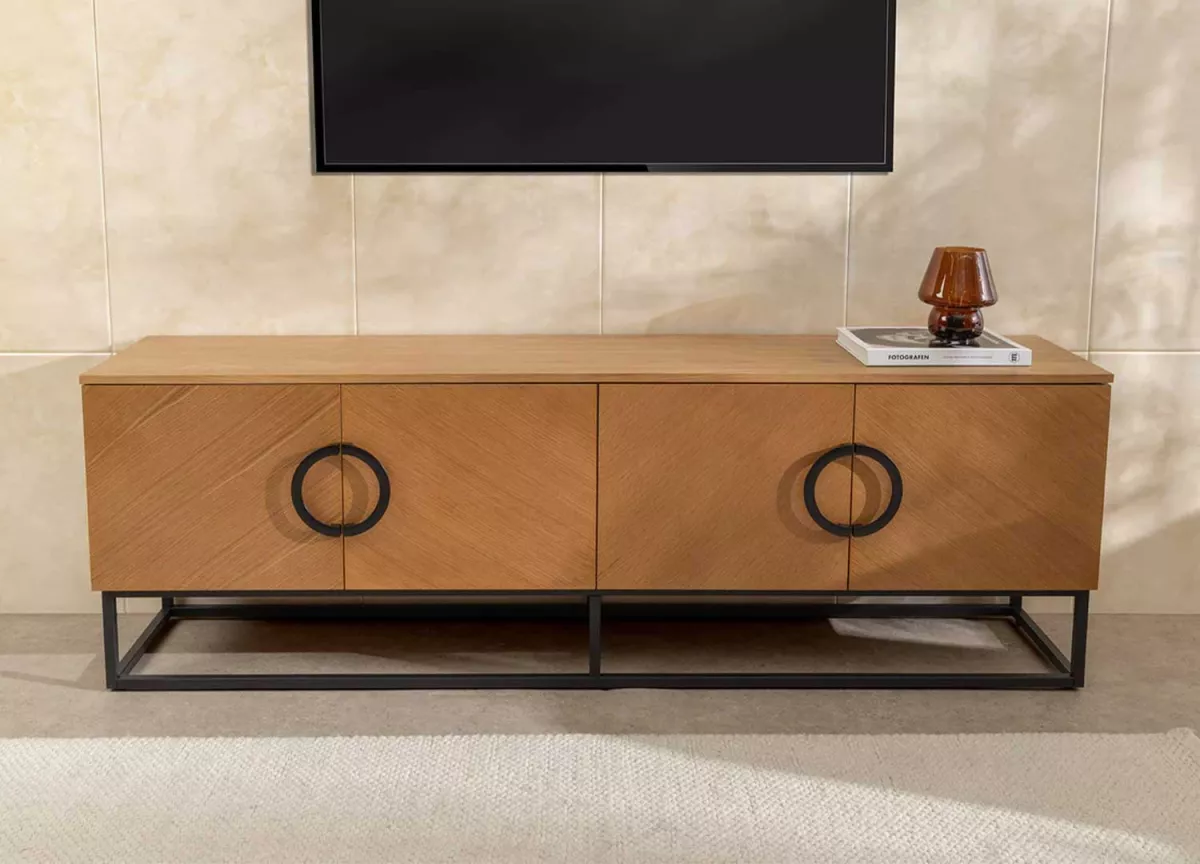 Sous ses allures sages, ce meuble TV de 180 cm cache un vrai tempérament. Son placage chêne clair capte la lumière, ses lignes se tendent, puis s’adoucissent, et son piétement en métal noir le fait presque léviter. Derrière ses portes aux grandes poignées graphiques, un monde bien rangé : câbles, box et secrets du salon disparaissent avec élégance. À mi-chemin entre nature et design, il impose sa présence sans bruit — juste une note de calme et de caractère au cœur du séjour.