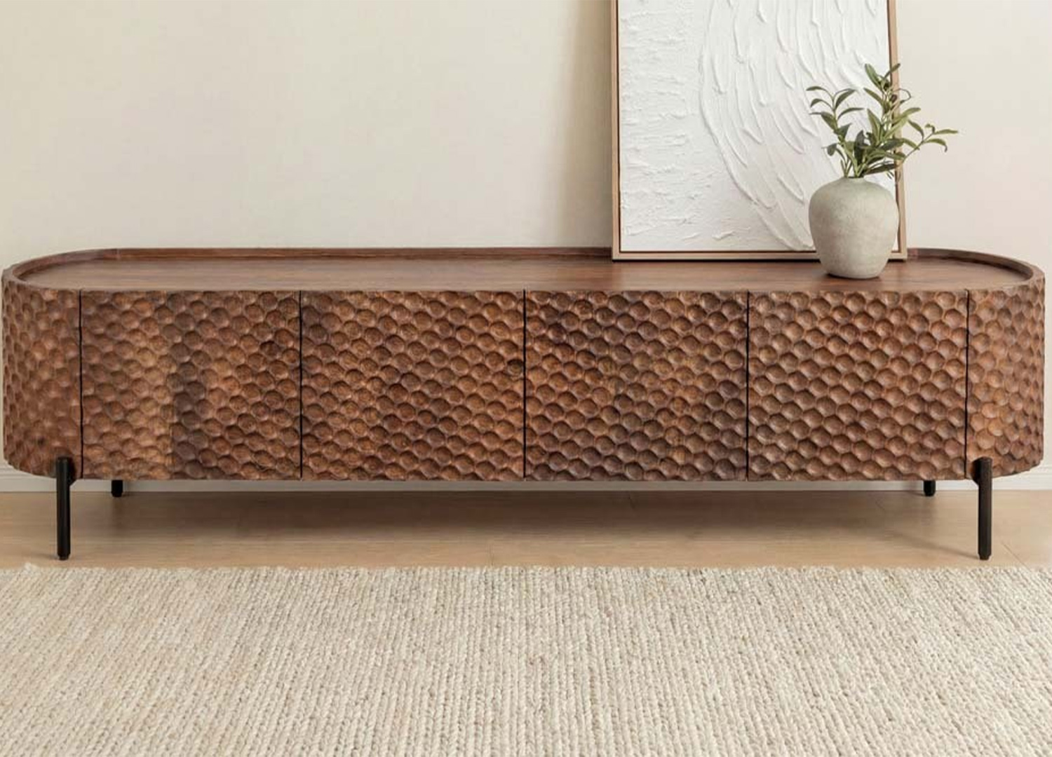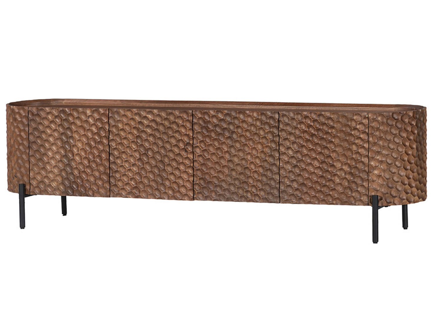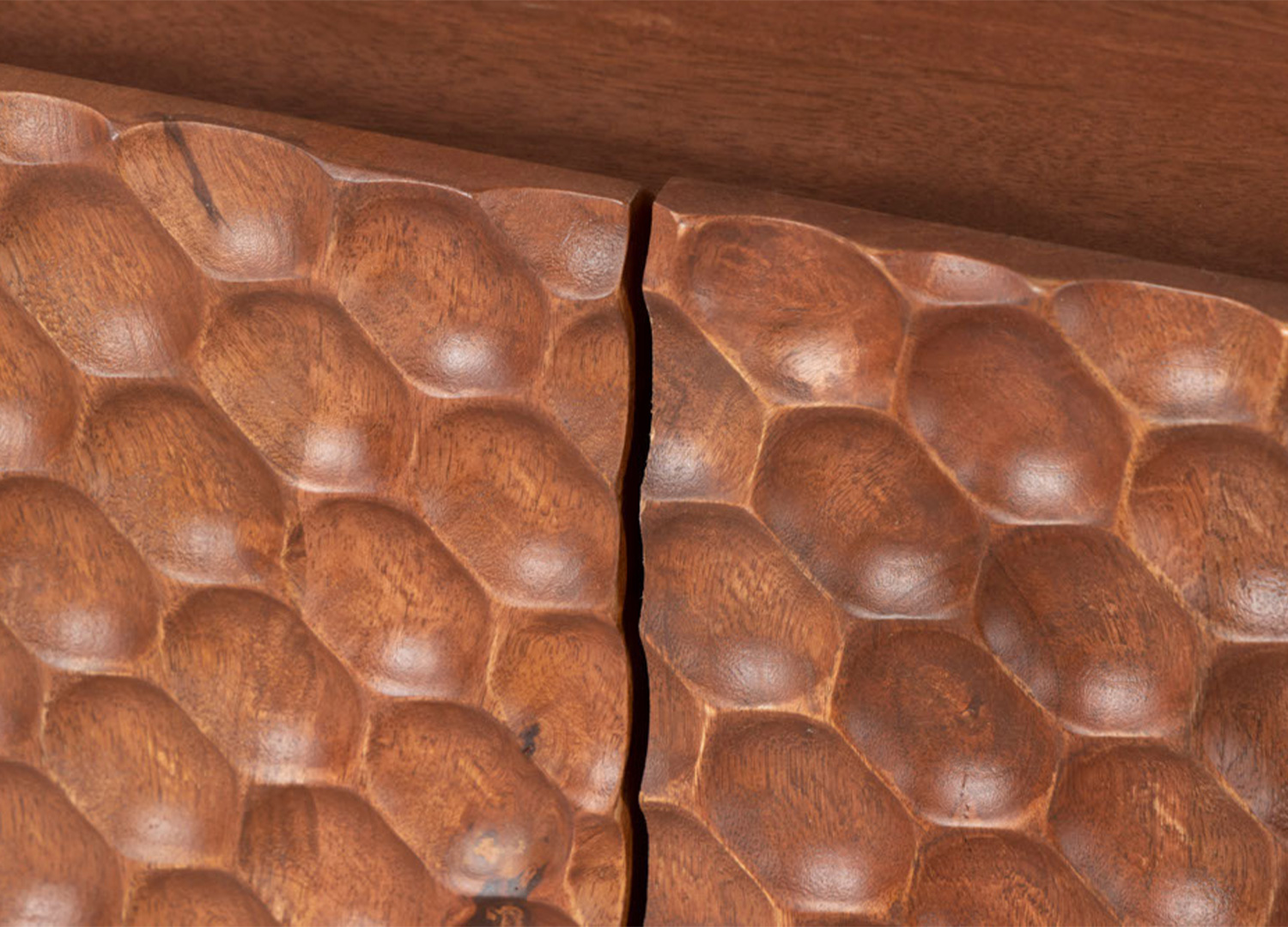 Le meuble TV MADERA, réalisé en manguier massif dans une teinte brune, révèle les nuances vivantes du bois et attire le regard par sa façade 3D en motif alvéolé prolongée sur les côtés pour créer une ligne continue.