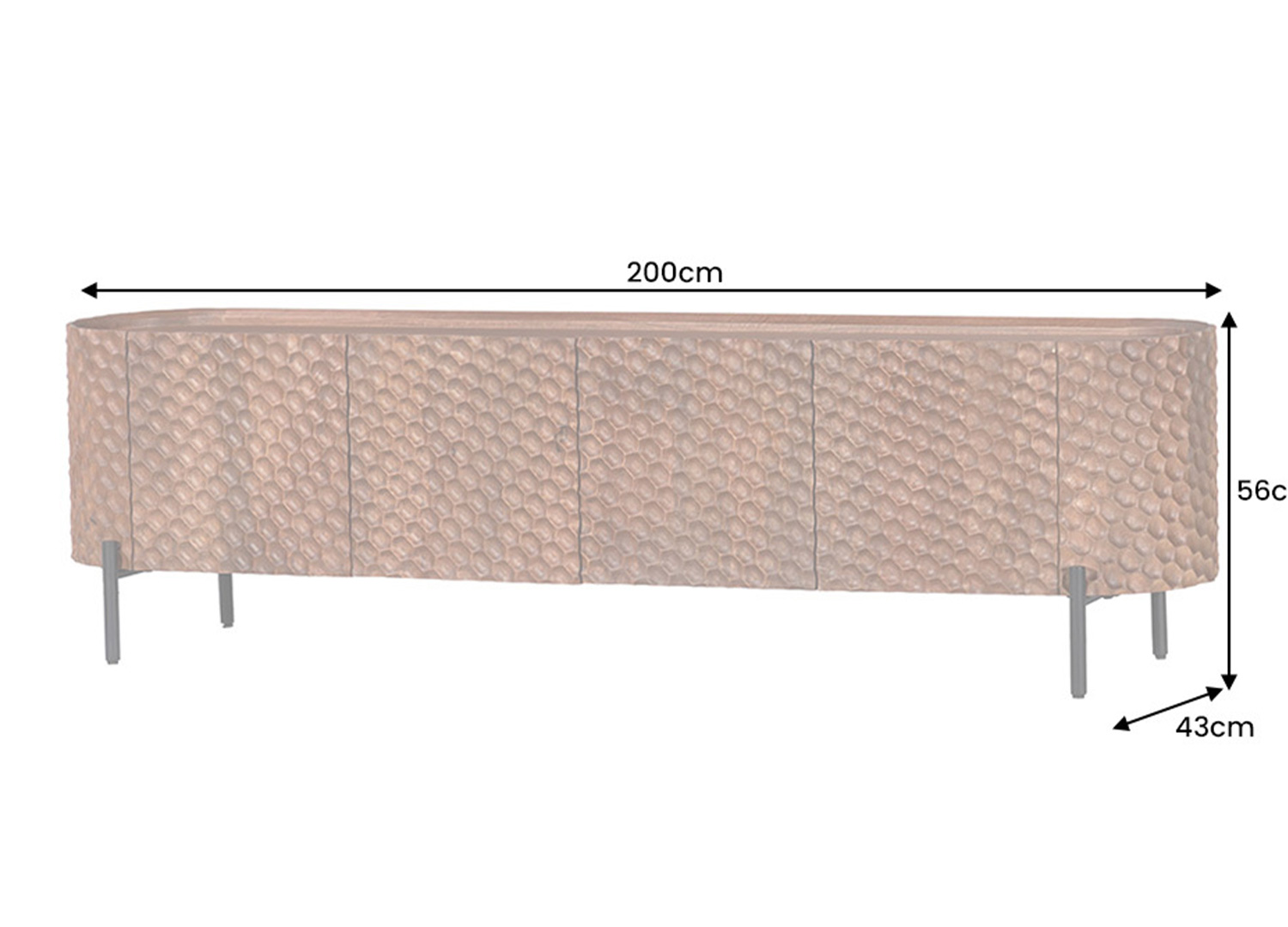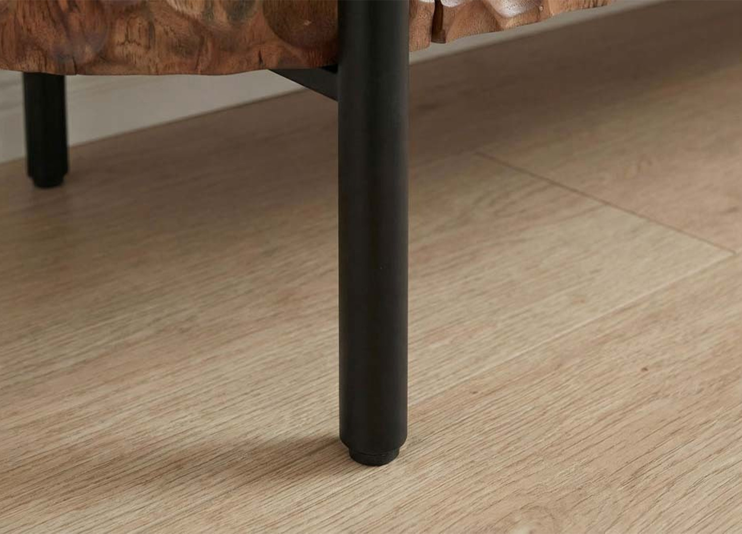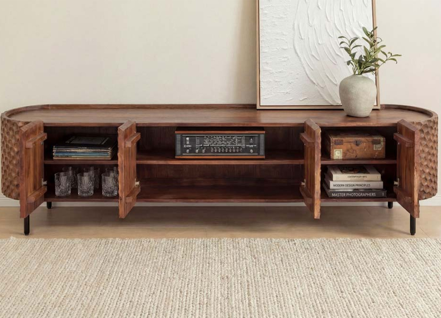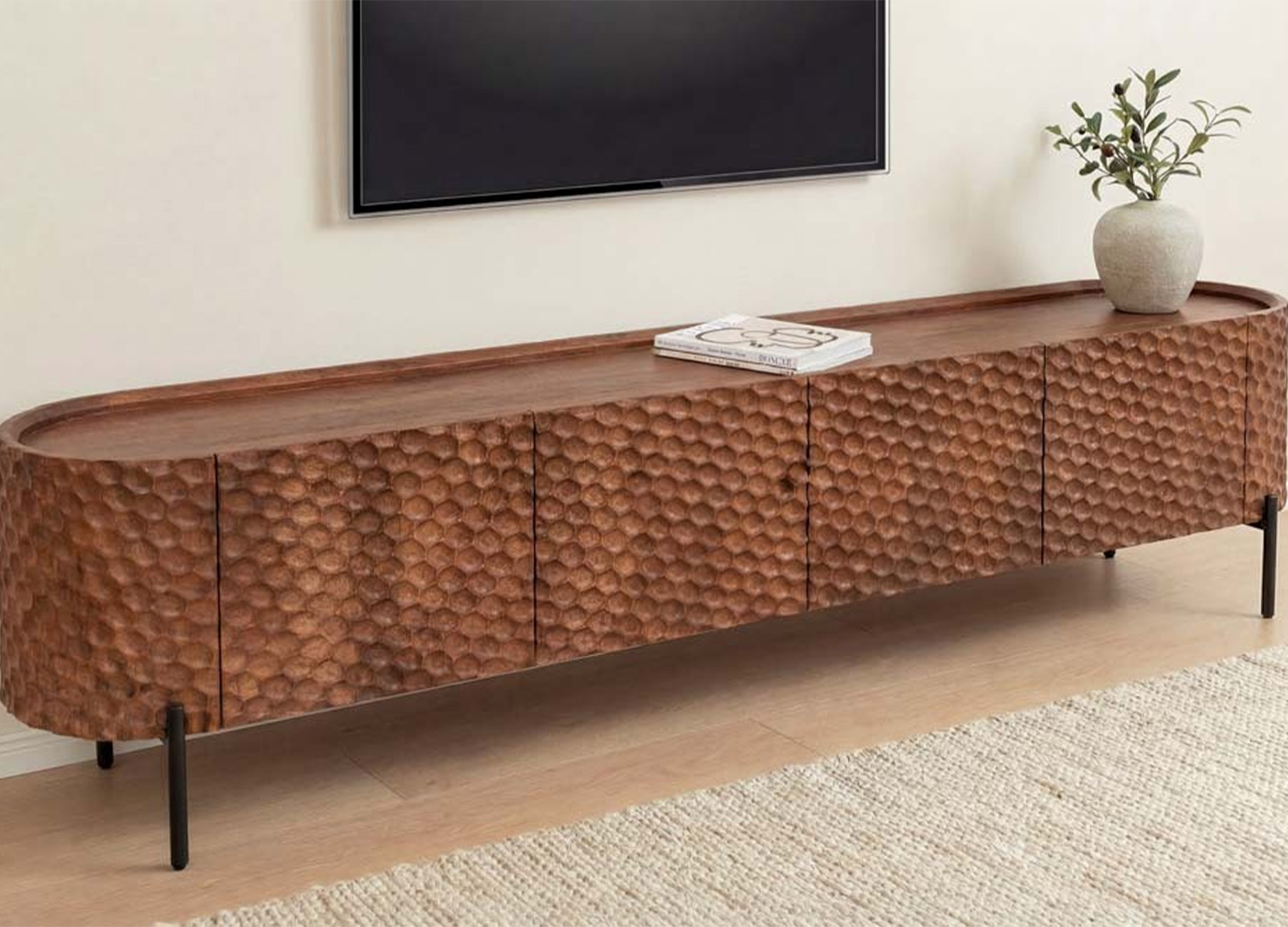 Le meuble TV MADERA, réalisé en manguier massif dans une teinte brune, révèle les nuances vivantes du bois et attire le regard par sa façade 3D en motif alvéolé prolongée sur les côtés pour créer une ligne continue.