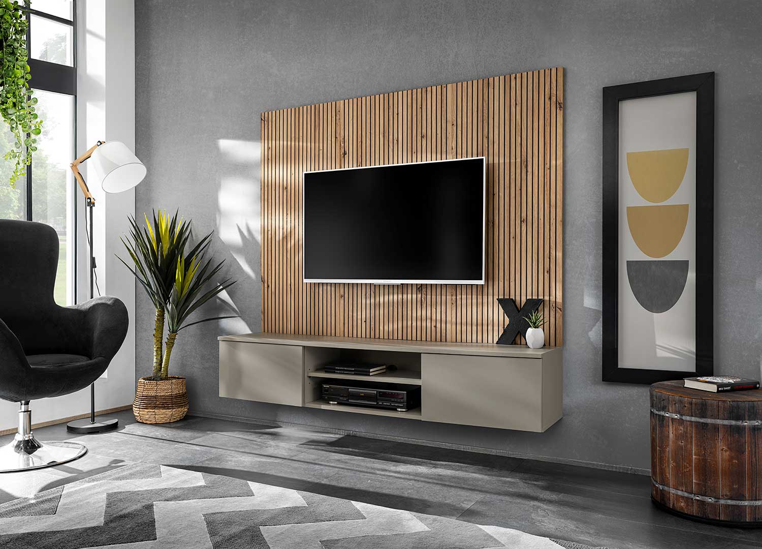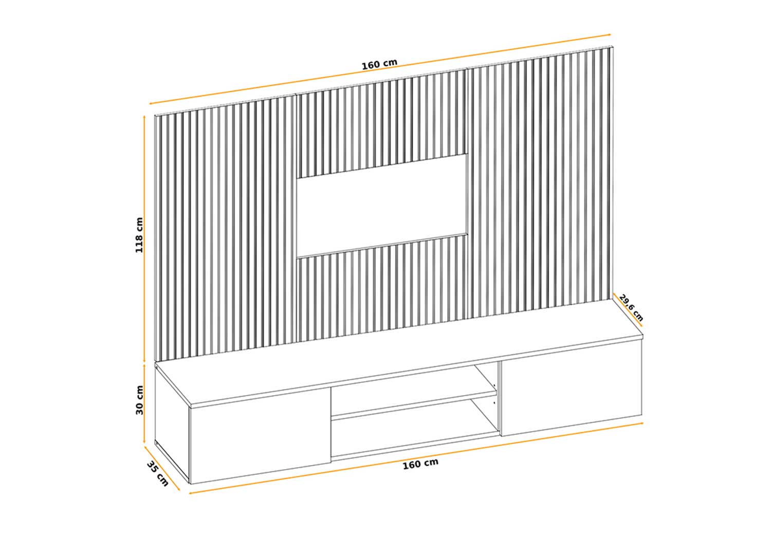 Cet ensemble TV de 160 cm va droit au but : une ligne suspendue, un panneau mural rainuré effet bois et une composition qui donne du rythme au mur sans l’alourdir. Le contraste entre la façade sobre du meuble bas et le décor vertical plus graphique crée un rendu net, actuel et plein de présence.