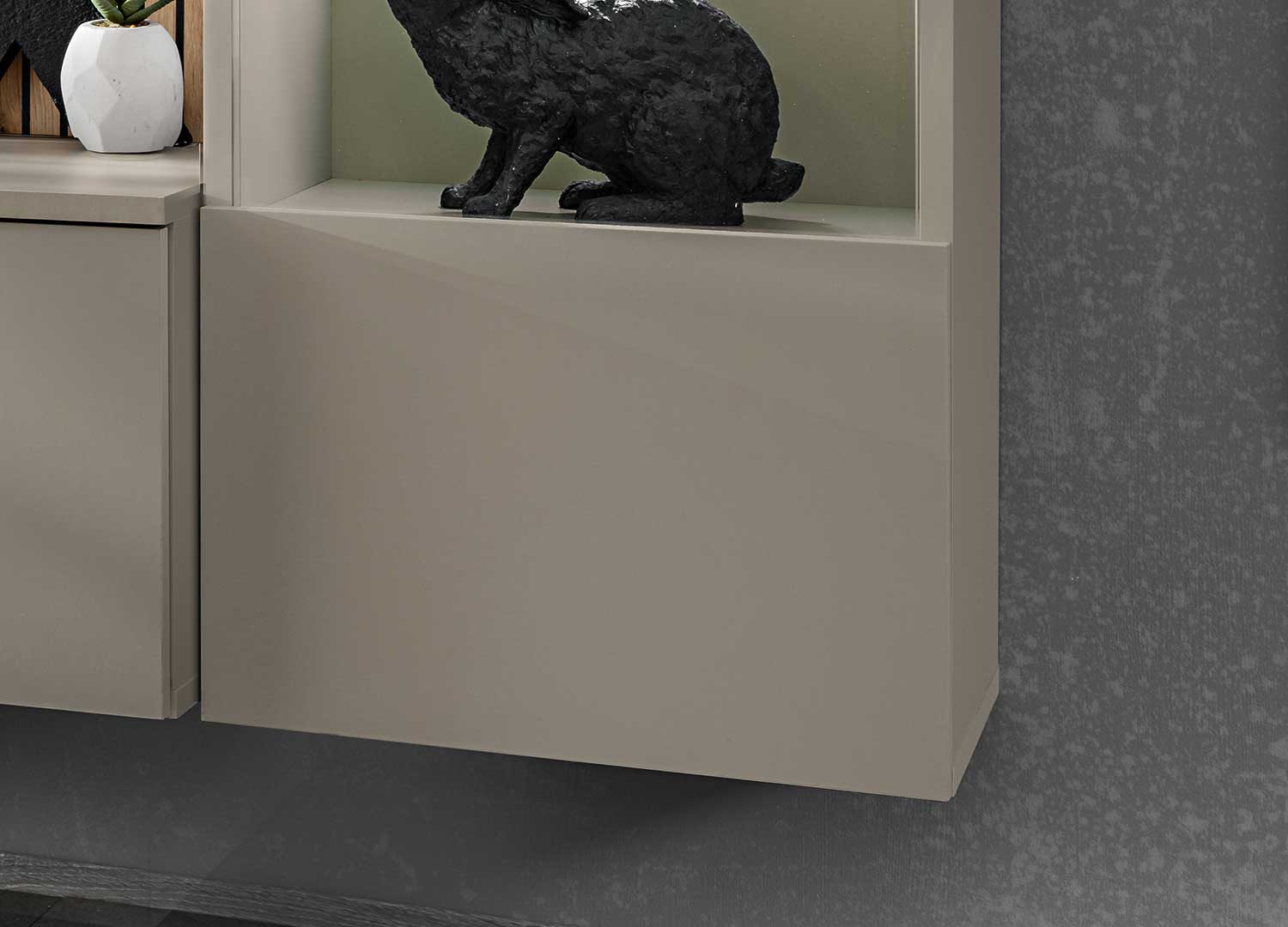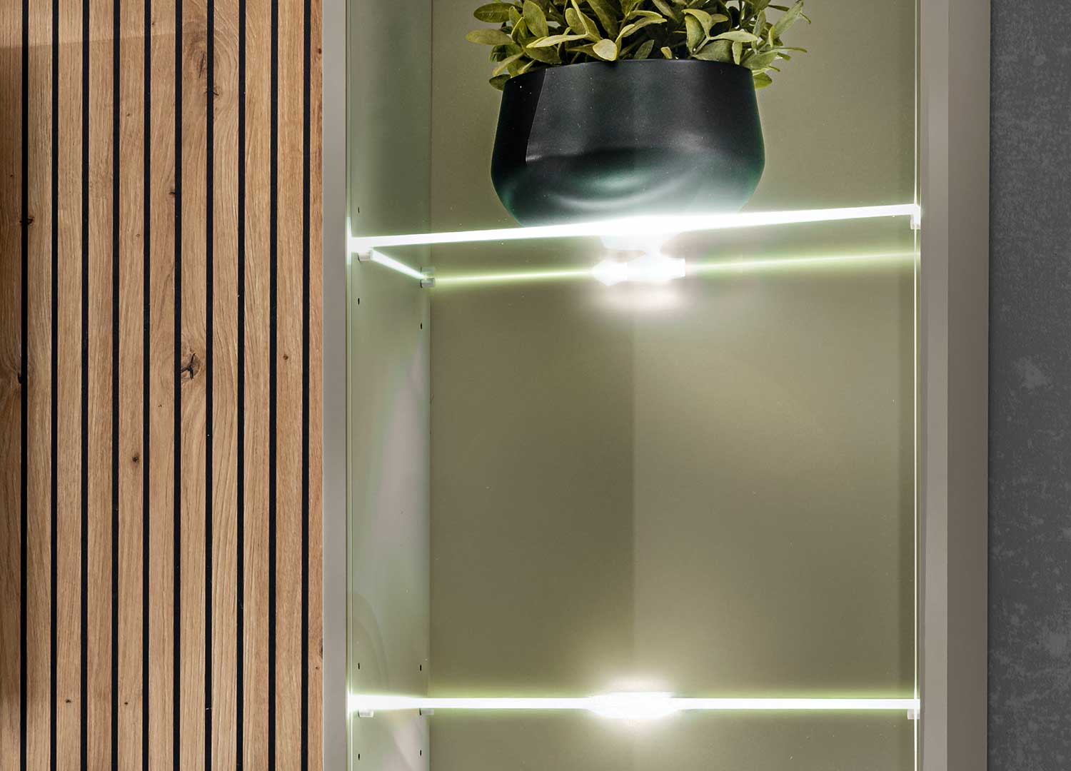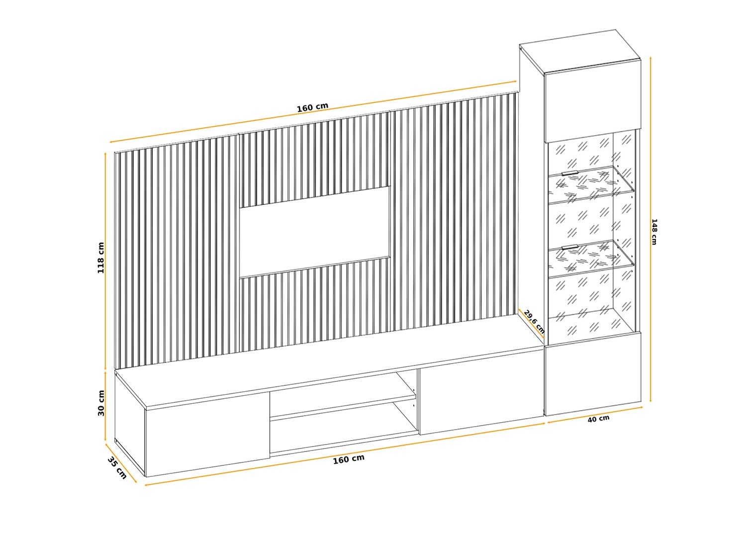 Sur la droite, la colonne murale partiellement vitrée intègre 2 étagères classiques et 2 étagères en verre avec éclairage LED blanc, idéales pour mettre en valeur vos objets décoratifs. En partie basse, le meuble TV mise sur une organisation efficace : une porte battante vers le bas à gauche et une porte battante vers le bas à droite, avec 1 compartiment derrière chacune des portes, tandis qu’au centre, un espace ouvert divisé par une étagère permet d’installer facilement vos appareils multimédias.