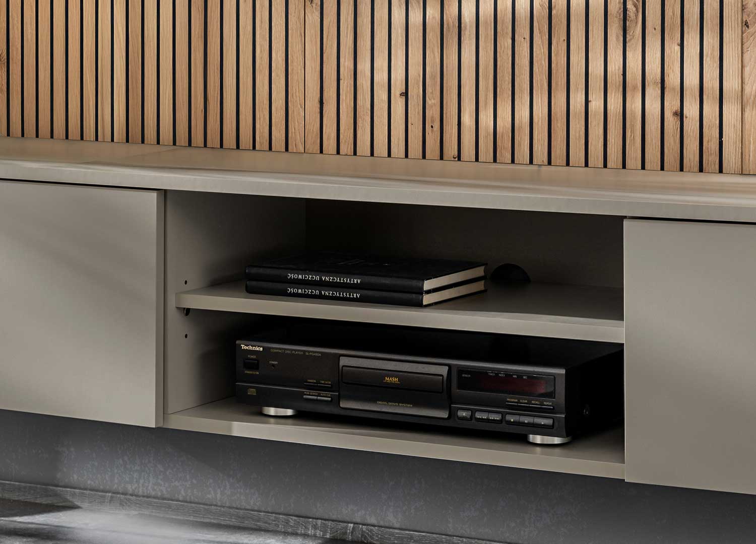 Dès le premier regard, cet ensemble TV de 2m affirme une vraie présence. Entre la sobriété chic du gris argile et la chaleur authentique du chêne artisan, l’équilibre est immédiat et le rendu résolument contemporain.