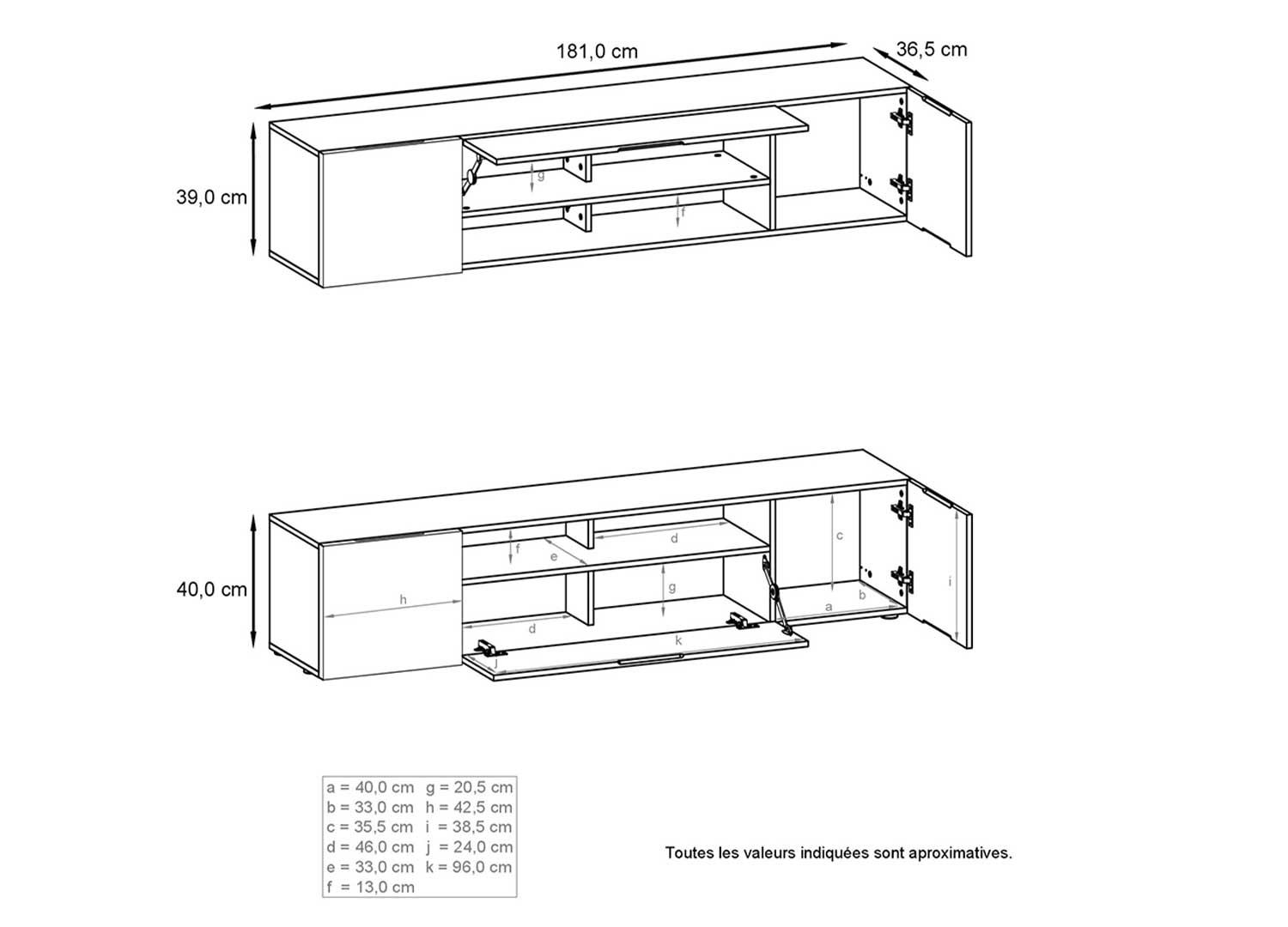 Cet ensemble TV se compose de deux bancs TV identiques, l’un posé au sol et l’autre fixé au mur au-dessus, afin de laisser l’espace souhaité pour le téléviseur entre les deux éléments. Chaque meuble intègre 2 portes, 1 abattant central et 1 niche ouverte. Derrière les portes, on retrouve deux grands compartiments latéraux, tandis que l’abattant central cache deux espaces supplémentaires. La niche ouverte du meuble bas accueille facilement box, console ou ampli, et celle du meuble haut se prête parfaitement aux DVD, livres ou objets déco.