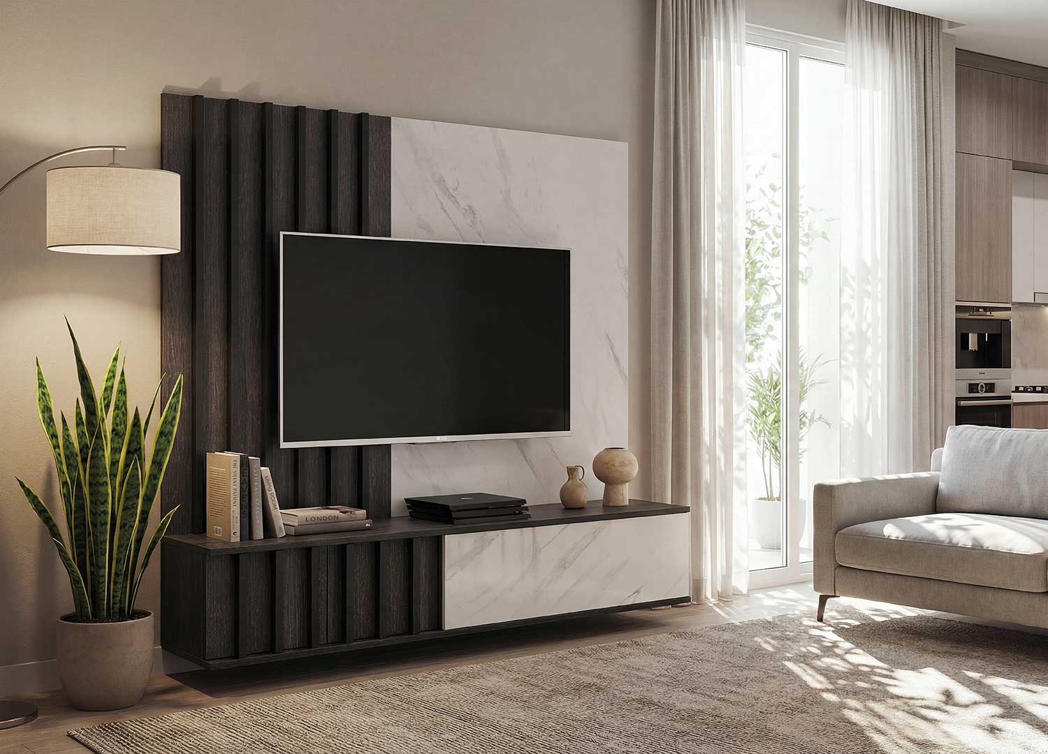 Les parties gauches du panneau mural et du panneau bas affichent une texture rainurée élégante. À droite, la finition effet marbre blanc signe une allure contemporaine.