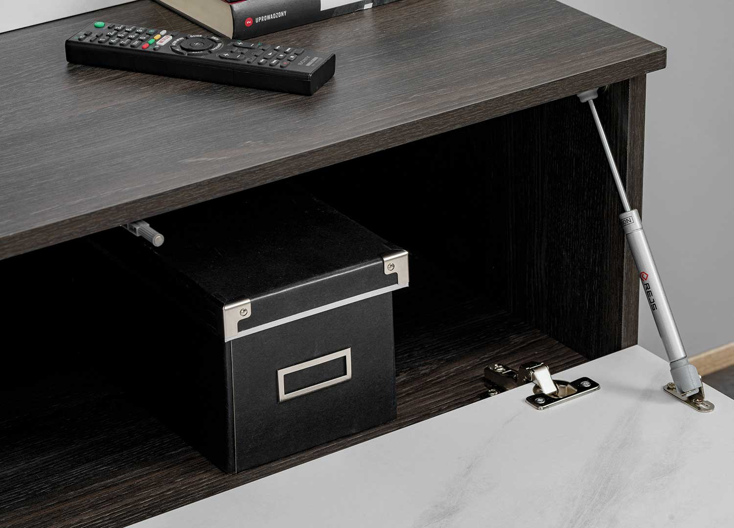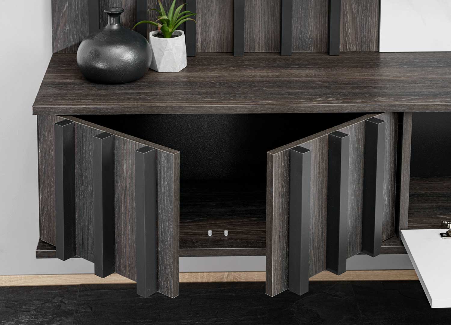 Ce meuble TV a été pensé pour un usage simple et fonctionnel. Le banc TV suspendu est doté de deux éléments : derrière les deux portes de gauche, un compartiment permet de ranger l’essentiel en toute discrétion ; derrière la porte battante vers le bas, un compartiment supplémentaire offre un espace pratique pour les équipements et les accessoires de salon.