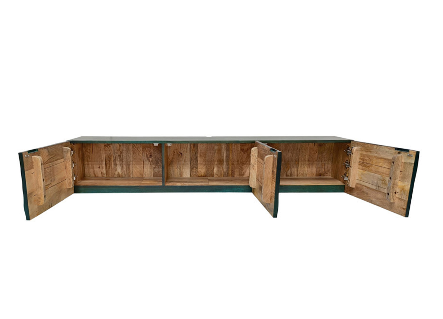 Derrière ses trois portes à fermeture magnétique, le meuble dévoile trois grands compartiments qui accueillent facilement box, télécommandes, livres et accessoires du quotidien. L’intérieur en manguier naturel apporte un contraste chaleureux avec la façade turquoise et le passe câbles intégré permet de préserver une installation discrète.