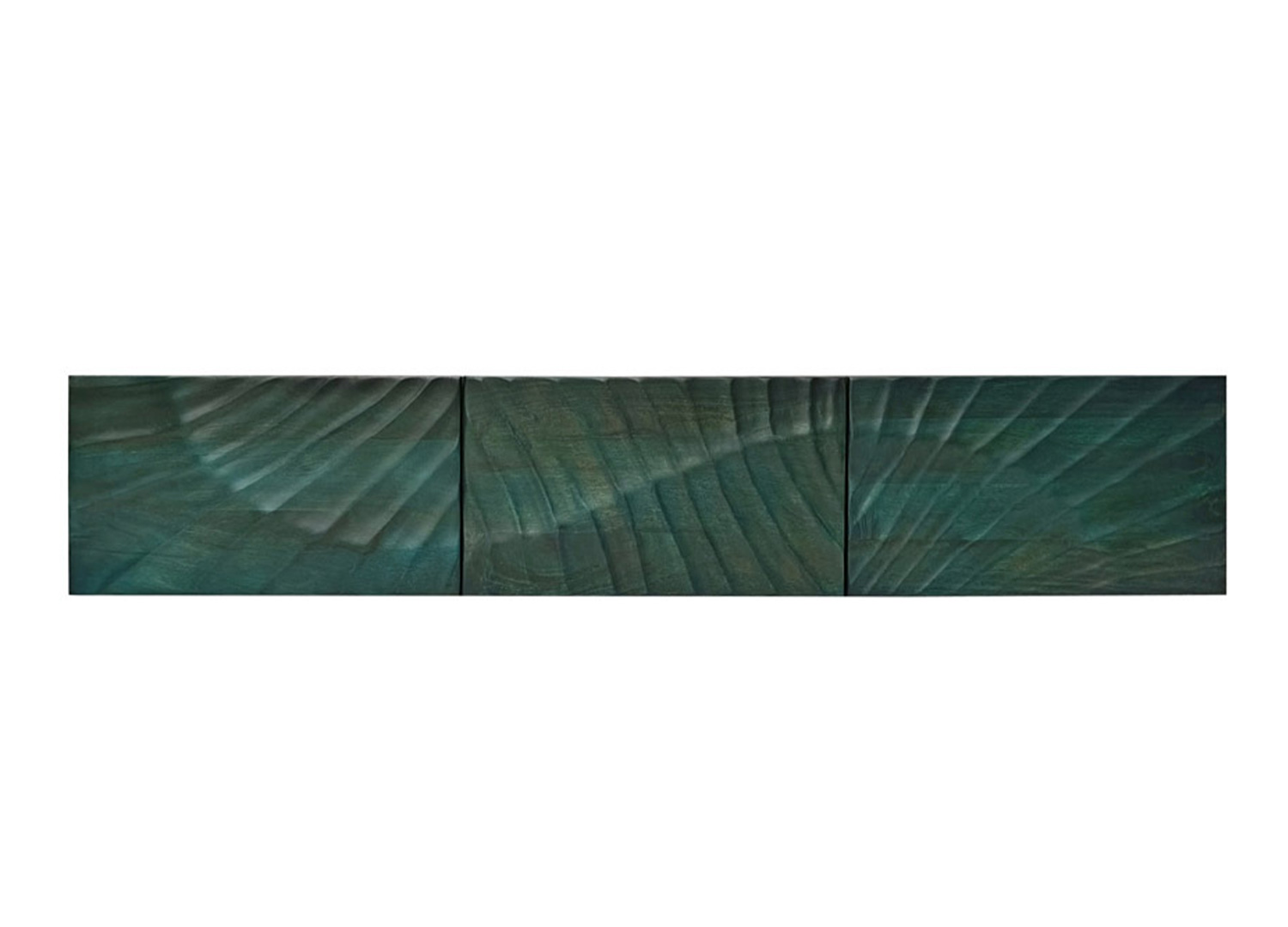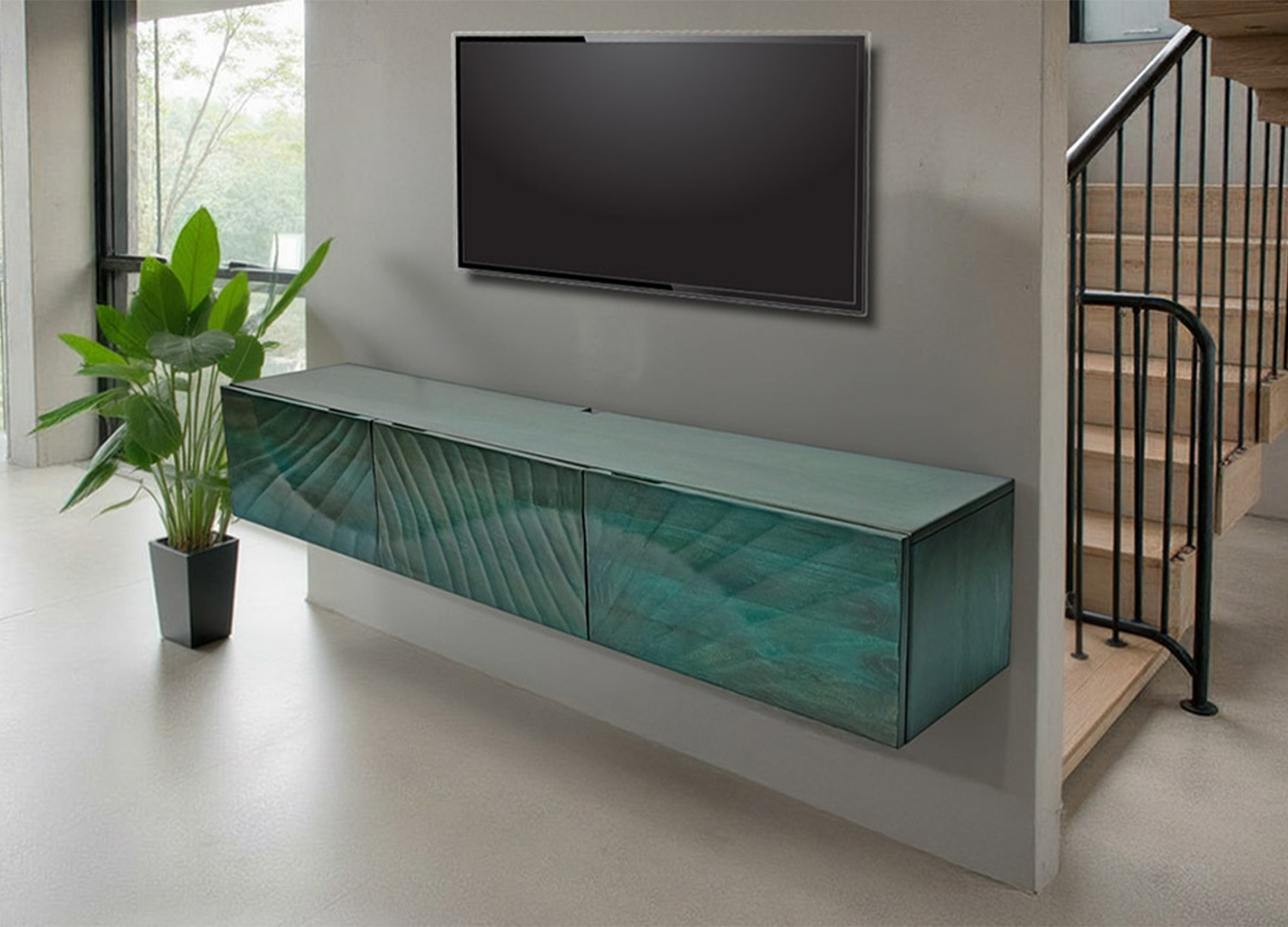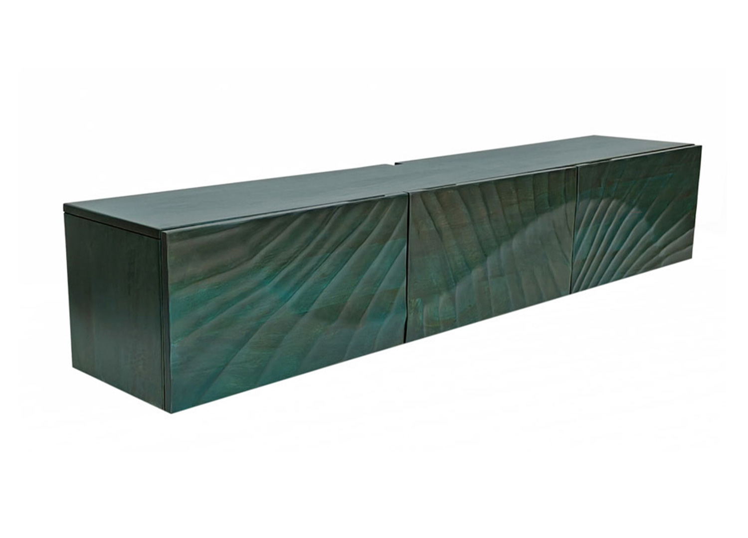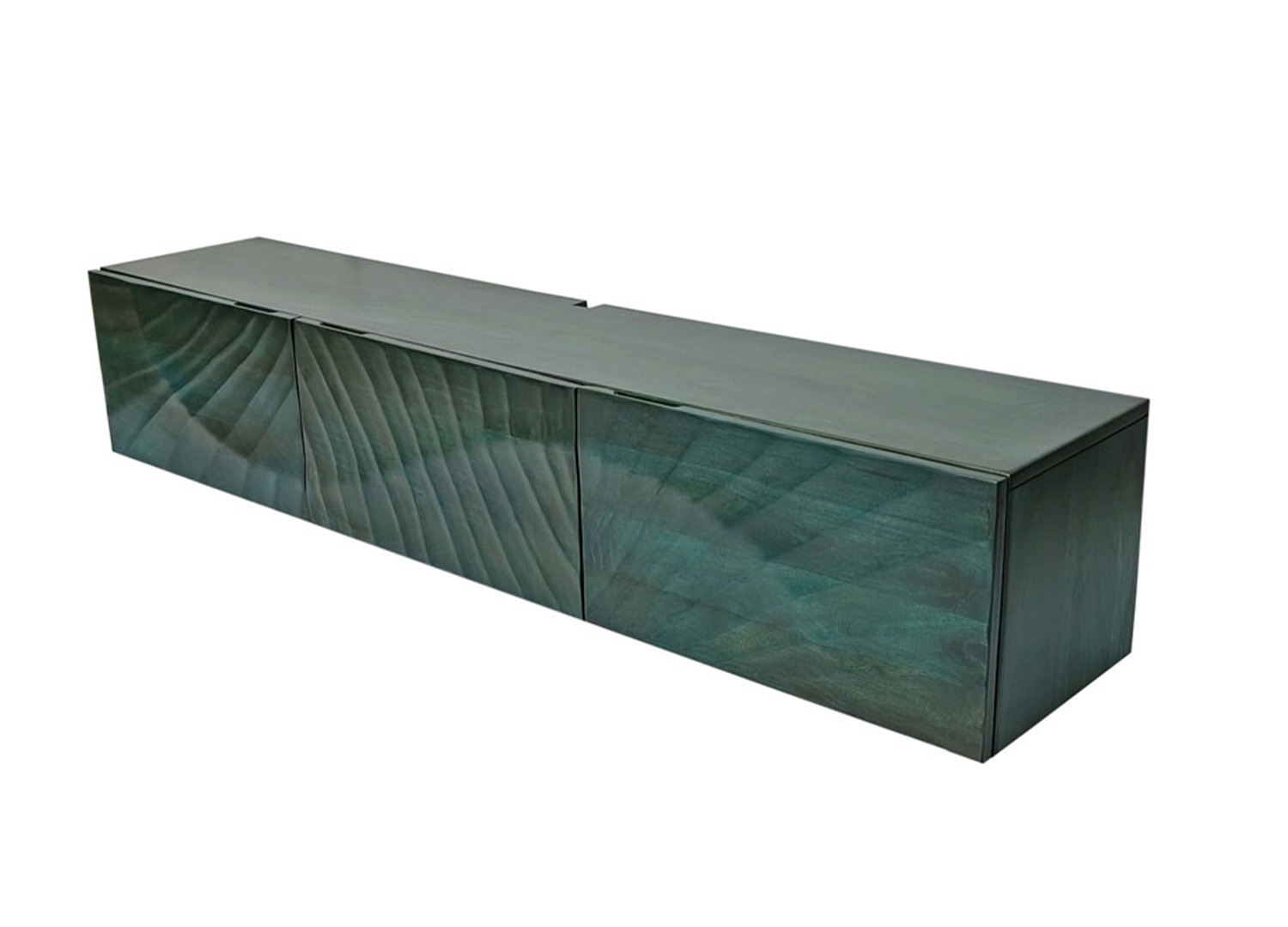 Réalisé en manguier massif laqué turquoise, ce meuble TV suspendu révèle une teinte profonde qui change subtilement avec la lumière. Sa façade animée par une sculpture 3D façonnée à la main évoque un mouvement organique et fluide qui traverse le bois et donne au meuble toute sa singularité.