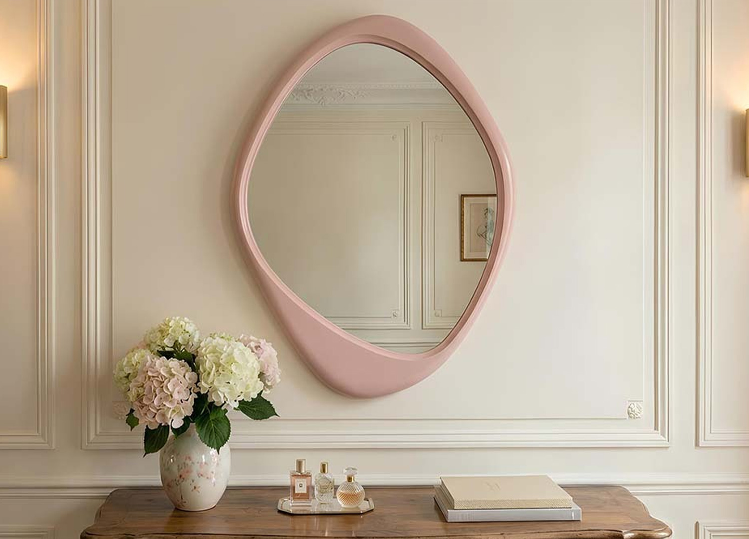 Avec sa silhouette libre et ses courbes irrégulières, ce miroir mural habille le mur avec une élégance toute en douceur. Son cadre rose apporte une note délicate et contemporaine, tandis que sa forme asymétrique casse les lignes trop strictes pour donner plus de mouvement à la pièce. Véritable élément décoratif, il agrandit visuellement l’espace et insuffle une atmosphère moderne et pleine de personnalité.