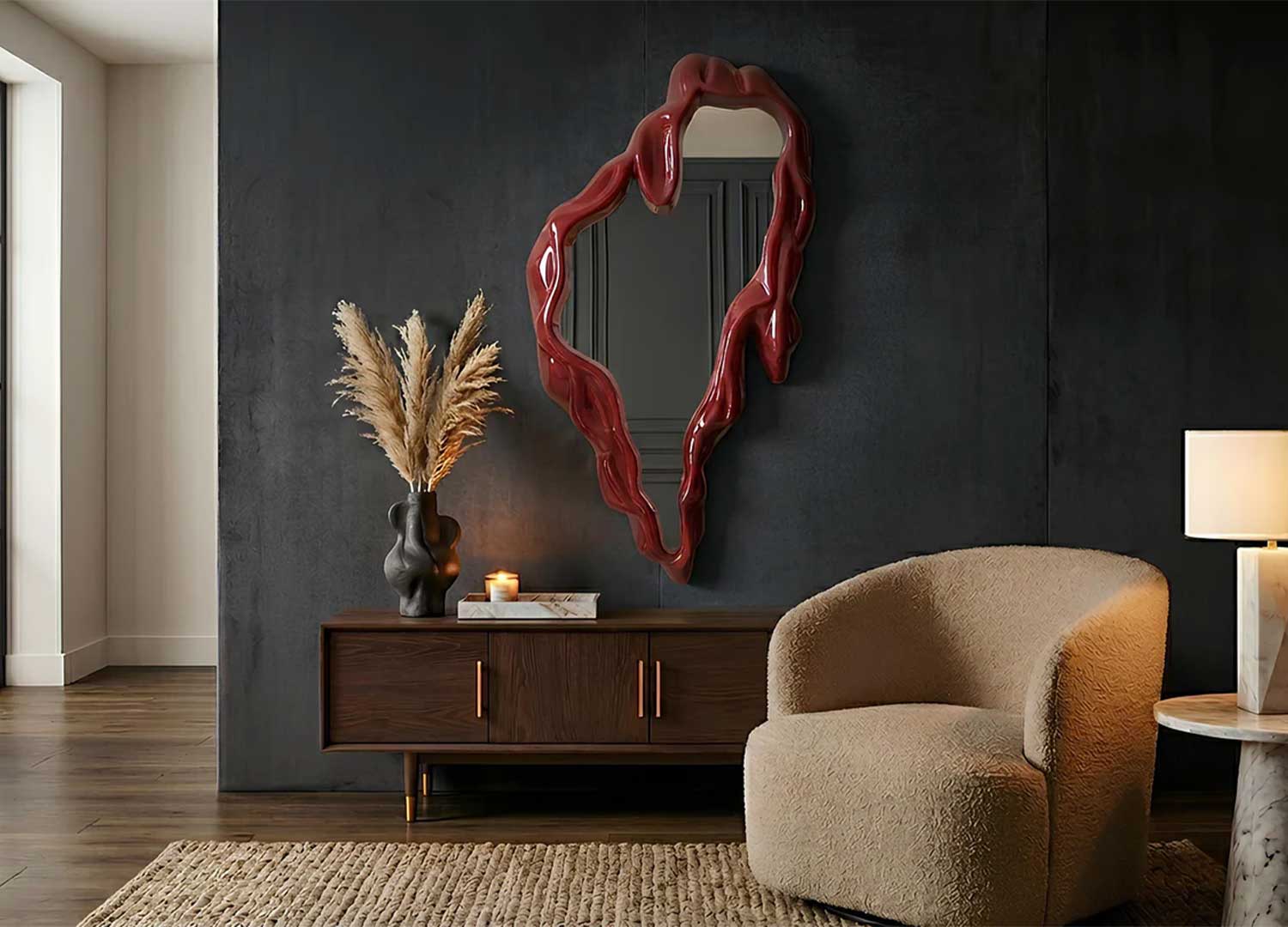 Avec son cadre rouge profond et sa silhouette organique aux lignes fluides, le miroir mural Voluta de 150 cm attire immédiatement le regard. Sa forme libre, presque mouvante, évoque une matière en fusion figée dans le temps. Résolument sculptural, il habille le mur avec audace et apporte à l’intérieur une présence artistique forte, pensée pour celles et ceux qui aiment les pièces qui ne passent pas inaperçues.