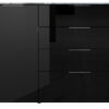 Un petit meuble buffet bahut moderne de couleur noir avec un verre sur les façades et sur le plateau supérieur. Ce buffet de 134 cm dispose de 1 porte ainsi que de 4 tiroirs. Ses beaux volumes de rangement accueilleront vaisselle ou accessoires de séjour facilement. Ce petit buffet noir apportera une ambiance élégante et sobre dans votre intérieur.
