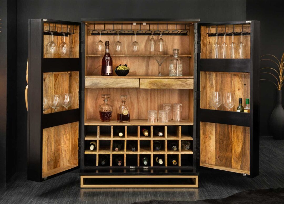 Ce meuble de bar haut en bois de manguier massif noir est un meuble très élégant qui ajoute une touche d'art à votre pièce. Ce meuble est conçu pour être placé auprès de votre table à manger pour une mise à disposition de vos bouteilles et verres à vin lors de repas conviviaux. La façade est ornée d'un décor oriental unique couleur cuivre qui attirera l'attention des invités et ajoutera une touche exotique à l'espace. Le meuble de bar est fait à la main en bois de manguier massif noir et est conçu pour durer des années. Les portes doubles sont équipées de ferrures qui permettent une ouverture et une fermeture faciles et une sécurité maximale. Le meuble de bar comporte également des étagères intérieures ainsi que des tiroirs, ce qui en fait un excellent moyen de ranger et d'exposer vos bouteilles de spiritueux préférées. En outre, l'étagère et les compartiments de portes sont parfait pour compléter le rangement global de votre buffet haut.