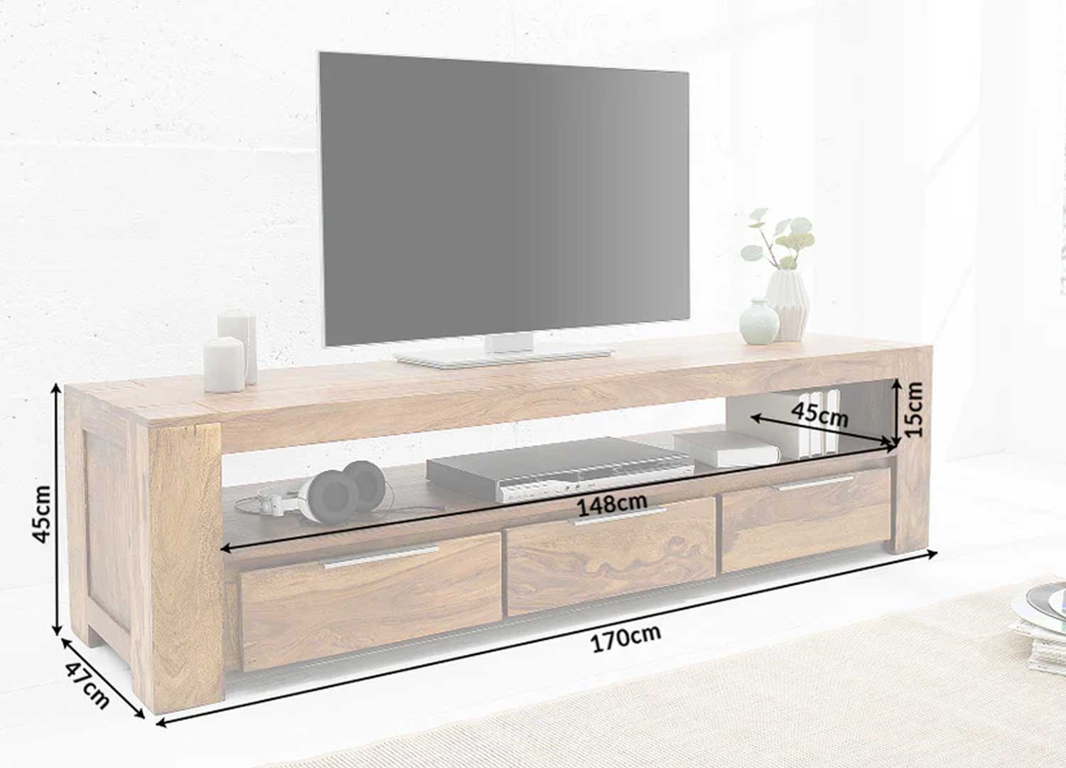 Un meuble en bois massif de Sesham au grain noble et naturel affirmant un look rétro. Un meuble TV de 170 cm de long offrant suffisamment d'espaces de stockage pour vos accessoires ; 3 tiroirs et une grande niche ouverte pour vos appareils multimédias. Un meuble à combiner avec une bibliothèque, une table basse ou un meuble de bar de la même collection.