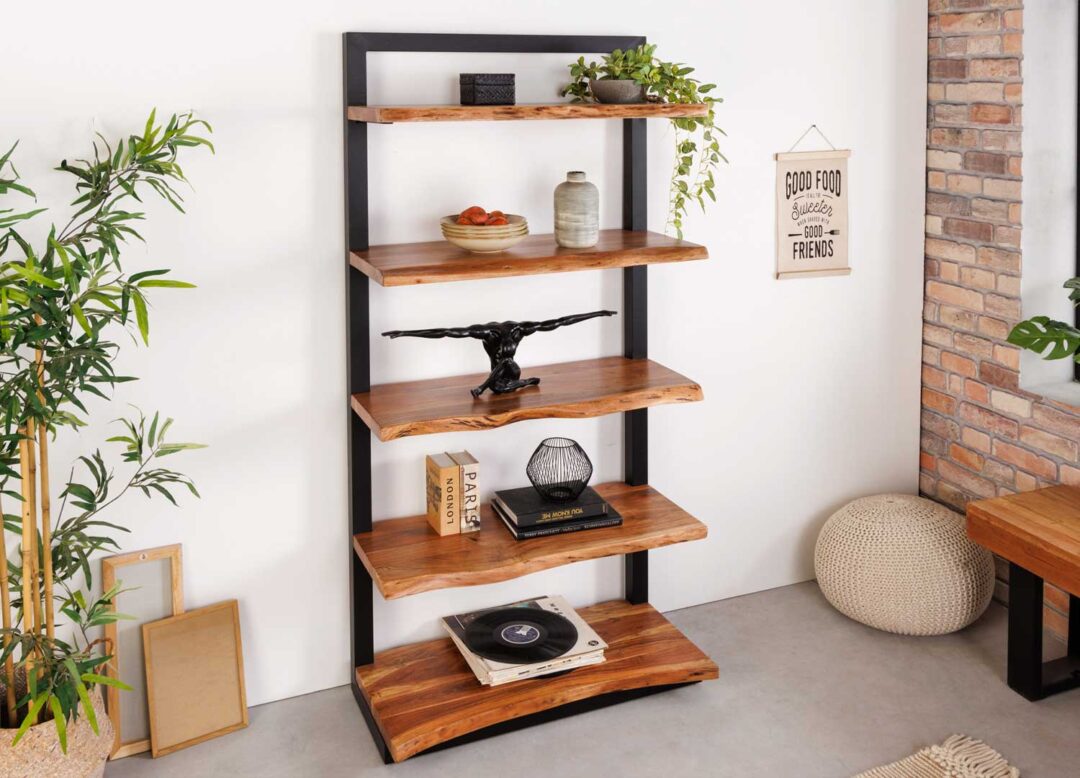 Bibliothèque 5 étagères en bois massif d’acacia et métal noir