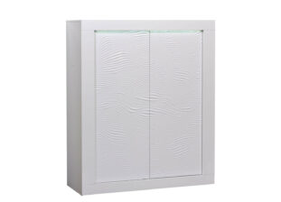 Un meuble de rangement haut de 2 portes proposé en blanc laqué brillant avec façades à motifs courbés au décor bois de chêne clair pour un style moderne et épuré. Rangez vos appareils multimédias ou vos dossiers et documents dans celui-ci pour un meuble tout en un assurant le rangement et l'organisation de votre salon. Un éclairage LED blanc vient ajouter une touche tendance et lumineuse à votre meuble haut blanc. Associez cette commode haute avec les autres meubles blanc laqués et décor bois de la collection pour un intérieur aux couleurs et au design homogènes. Ce meuble buffet haut existe aussi en version laqué blanc complet pour un salon encore plus lumineux et sobre.